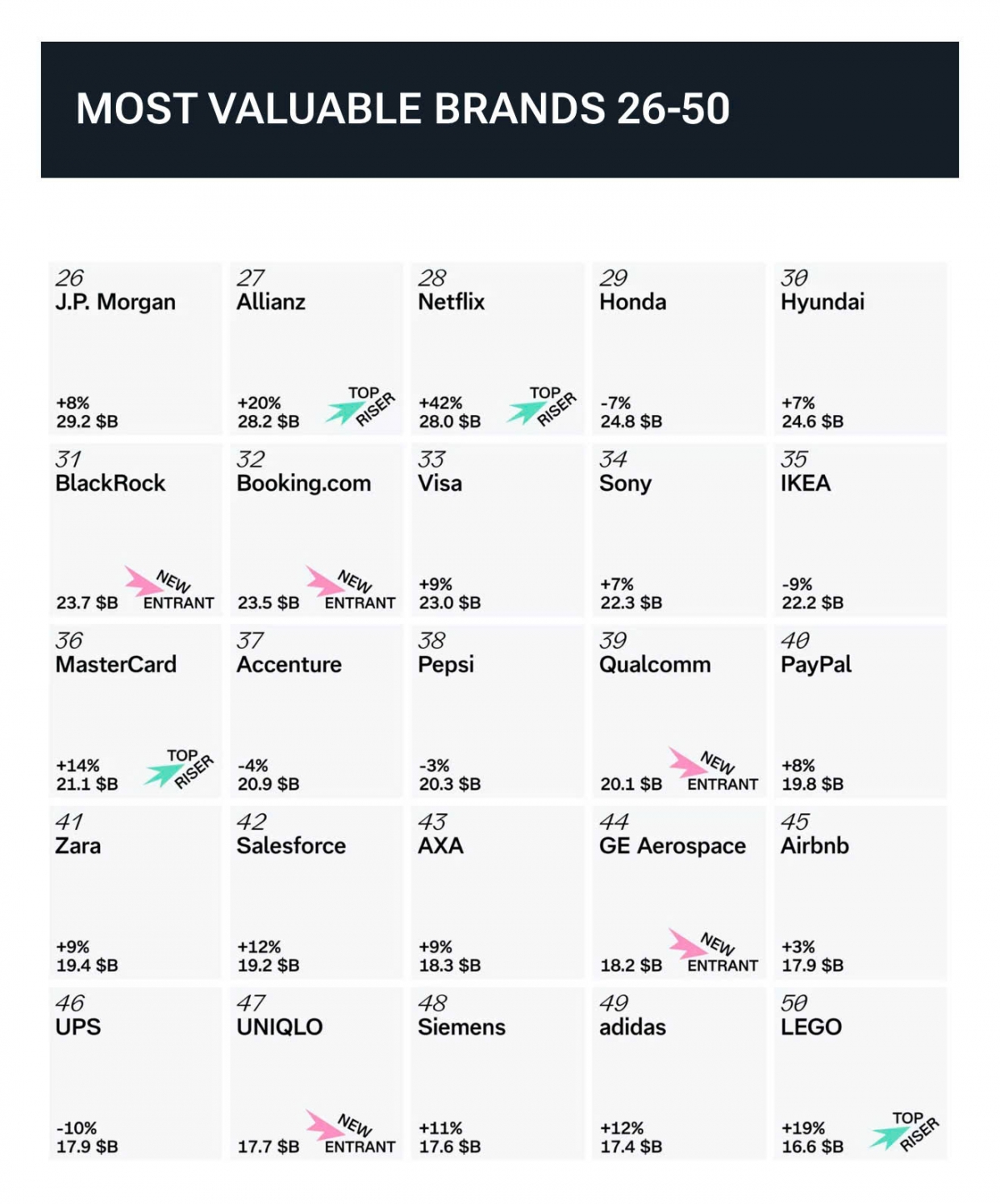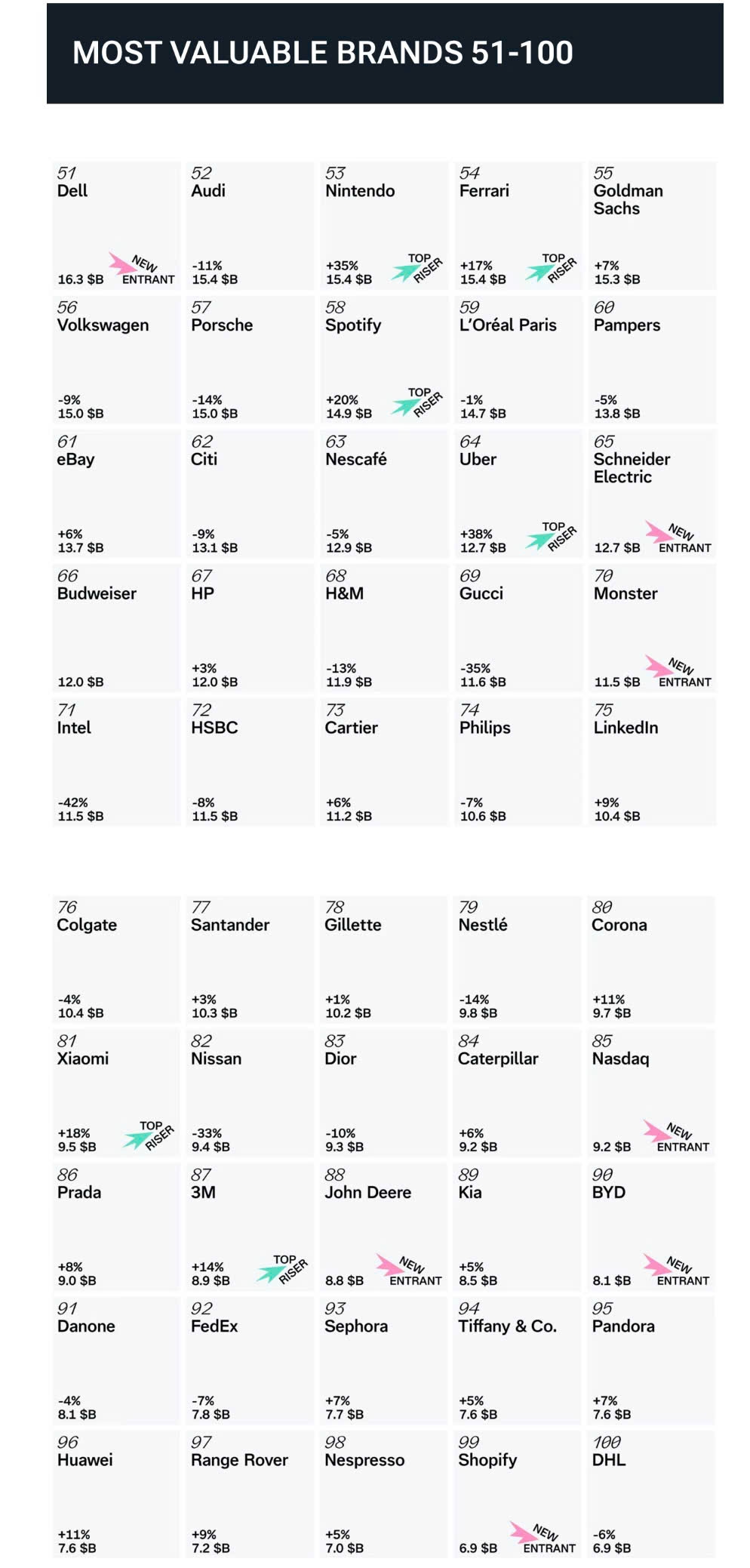 Tiếp tục xuống hạng trong danh sách là Honda (#29), Hyundai (#30), Sony (#34), Audi (#52) và Ferrari (#54). Tiếp theo là Volkswagen (#56), Porsche (#57), Uber (#64), Xiaomi (#81) và Nissan (#82). Những cái tên nổi bật còn lại là Kia (#89), Huawei (#96) và Range Rover (#97).