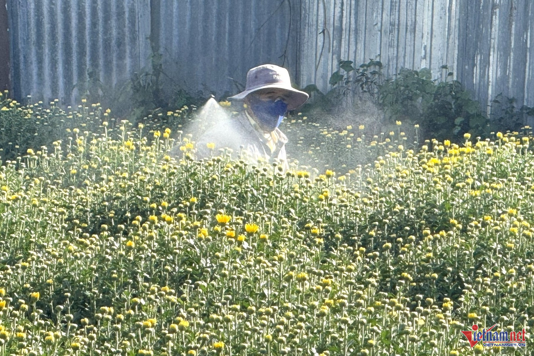 Một chủ vườn đang tưới cúc chờ thương lái đến bốc hàng. Ảnh: Hải Dương