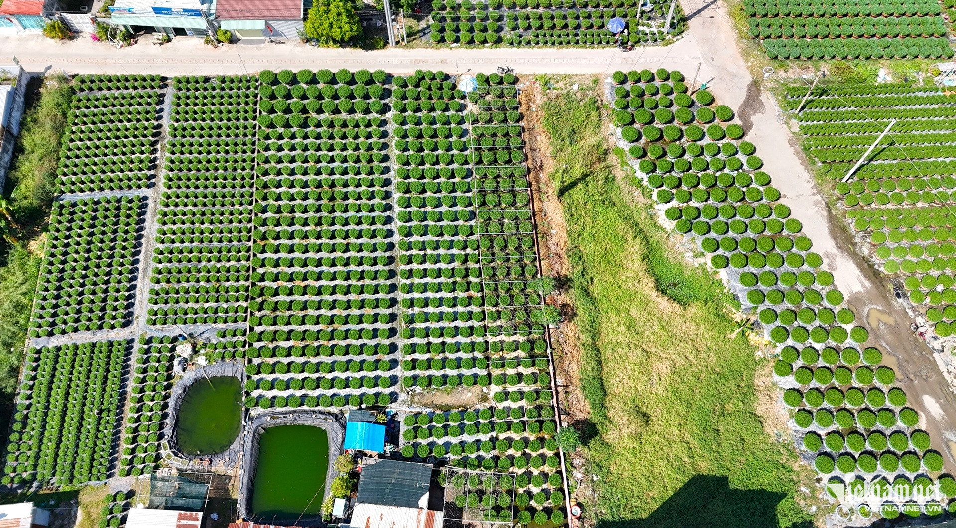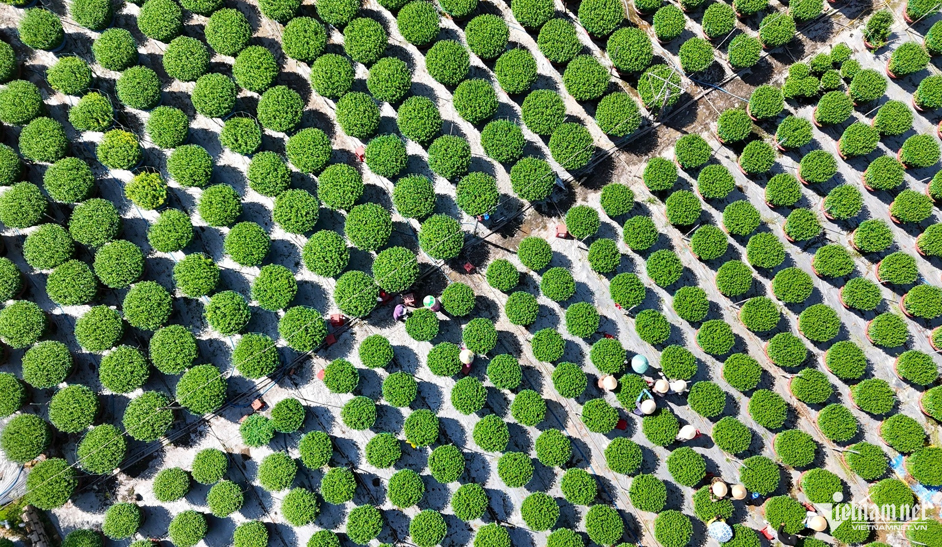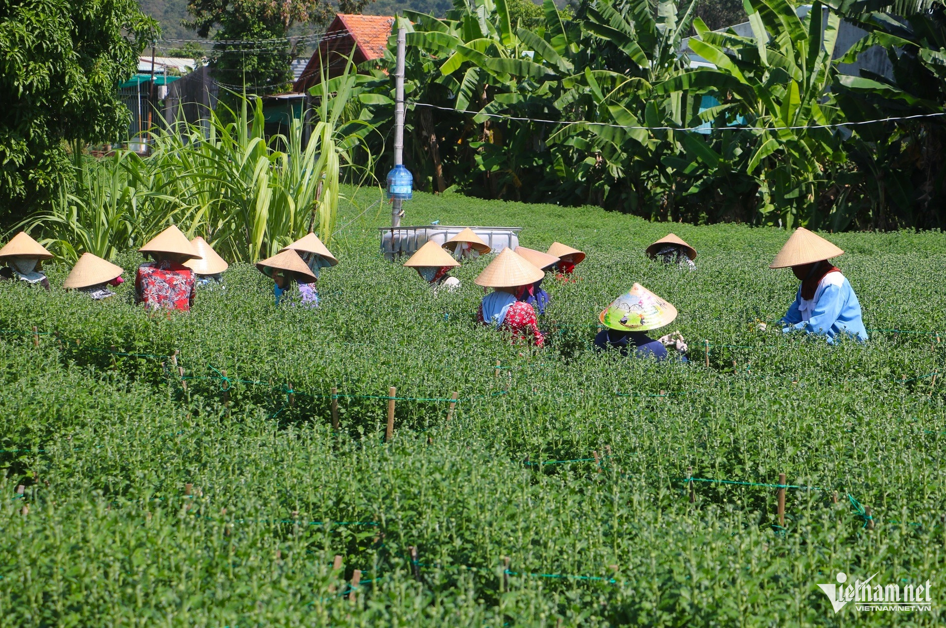 Dọc hai bên đường Trịnh Đình Thảo, những vườn cúc xanh mướt trải dài, các chậu hoa được xếp ngay ngắn. Chủ vườn cùng nhân công tất bật tỉa nụ, tưới nước để hoa nở đúng thời điểm.
