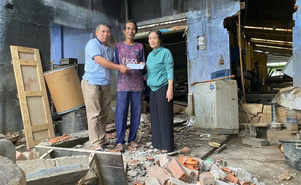 Đại diện Báo Pháp Luật TP.HCM trao tiền cứu trợ của bạn đọc đến gia đình ông Võ Hoài Nam ở phường Tuy Hòa.