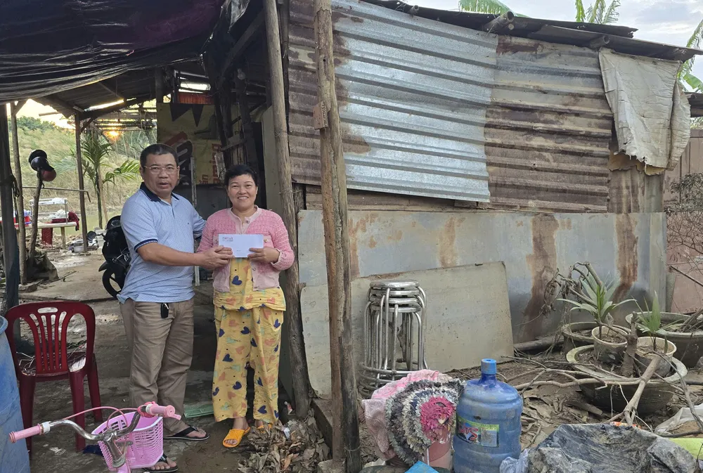 Đại diện Báo Pháp Luật TP.HCM trao tiền cứu trợ của bạn đọc đến gia đình bà Lê Thị Lượng ở phường Tuy Hòa.