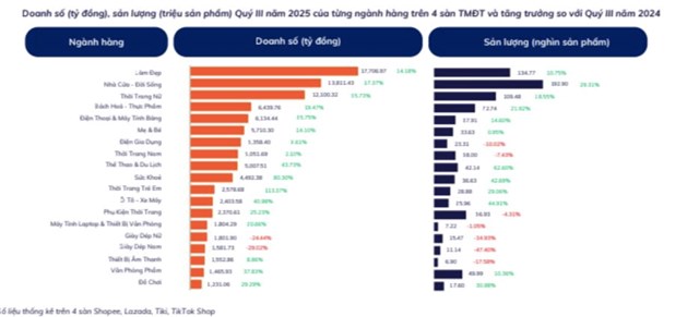 Ba ngành hàng dẫn đầu doanh số quý III/2025 là Làm đẹp (17,7 nghìn tỷ), Nhà cửa - Đời sống (13,8 nghìn tỷ) và Thời trang nữ (12,1 nghìn tỷ đồng).