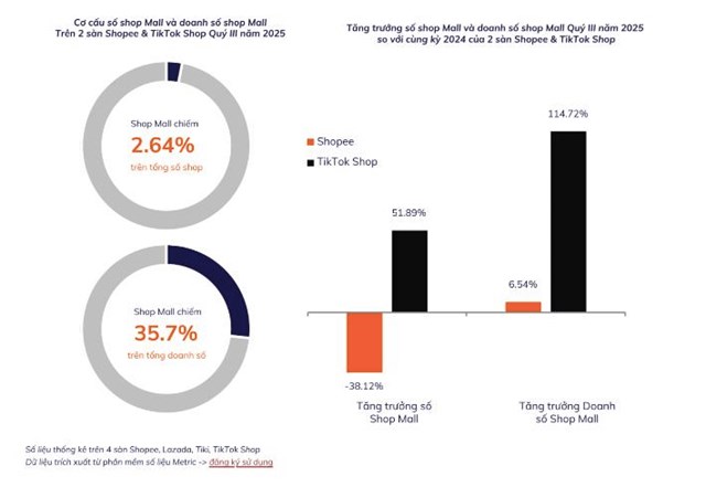 Dữ liệu từ Metric.vn cho thấy, số lượng Shop Mall trên TikTok Shop tăng 51,89% với doanh số tăng 114,72%. Trong khi đó, Shopee ghi nhận số lượng Shop Mall giảm 38,12% do chính sách kiểm soát chất lượng khắt khe hơn nhưng doanh số vẫn tăng 6,54%. Điều này phần nào cho thấy hiệu quả hoạt động của các cửa hàng chính hãng được cải thiện.