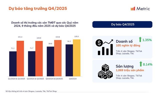 Chuyên gia của nền tảng tổng hợp và khai thác dữ liệu Metric.vn dự báo doanh số quý IV/2025 sẽ đạt 105 nghìn tỷ đồng, tăng 15% so với cùng kỳ năm 2024 và tăng 1,35% so với quý III/2025.