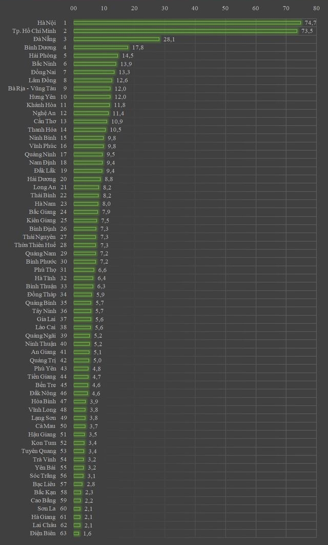 Hà Nội dẫn đầu cả nước với 74,7 điểm, theo sát phía sau là TP. Hồ Chí Minh với 73,5 điểm. Sự chênh lệch bắt đầu thể hiện rõ từ vị trí thứ ba của Đà Nẵng khi địa phương này chỉ đạt 28,1 điểm, tạo ra khoảng cách lớn so với thủ đô. Đáng chú ý, với mức điểm trung bình cả nước chỉ đạt 9,3, khoảng cách giữa đơn vị dẫn đầu và tỉnh thành thấp nhất đã lên tới 73,1 điểm. Thực trạng này đặt ra thách thức lớn về sự phát triển không đồng đều và đòi hỏi những giải pháp quyết liệt để thu hẹp khoảng cách chuyển đổi số giữa các địa phương.