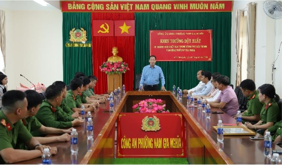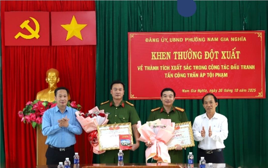 Tại buổi trao khen thưởng, Đảng ủy, UBND phường Nam Gia Nghĩa đã trao giấy khen, tặng hoa và thưởng nóng cho Công an phường Nam Gia Nghĩa, Phòng Cảnh sát hình sự, Công an tỉnh mỗi đơn vị 10 triệu đồng về thành tích xuất sắc trong việc nhanh chóng bắt giữ đối tượng thực hiện nhiều vụ trộm cắp tài sản. Theo đó, với tinh thần trách nhiệm cao, sự chủ động, mưu trí, dũng cảm, lực lượng Công an phường đã phối hợp với phòng Cảnh sát hình sự, bắt giữ đối tượng Hạng A Băng (SN 2005, trú tại phường Bắc Gia Nghĩa, tỉnh Lâm Đồng), thu giữ 02 máy tính xách tay, 07 điện thoại di động, 02 máy tính bảng, 01 xe máy và đồ vật có liên quan khác. Đây là đối tượng từng có tiền án về tội trộm cắp tài sản và trong thời gian vừa qua đã thực hiện nhiều vụ trộm cắp tài sản trên địa bàn phường Nam Gia Nghĩa và các địa phương lân cận.