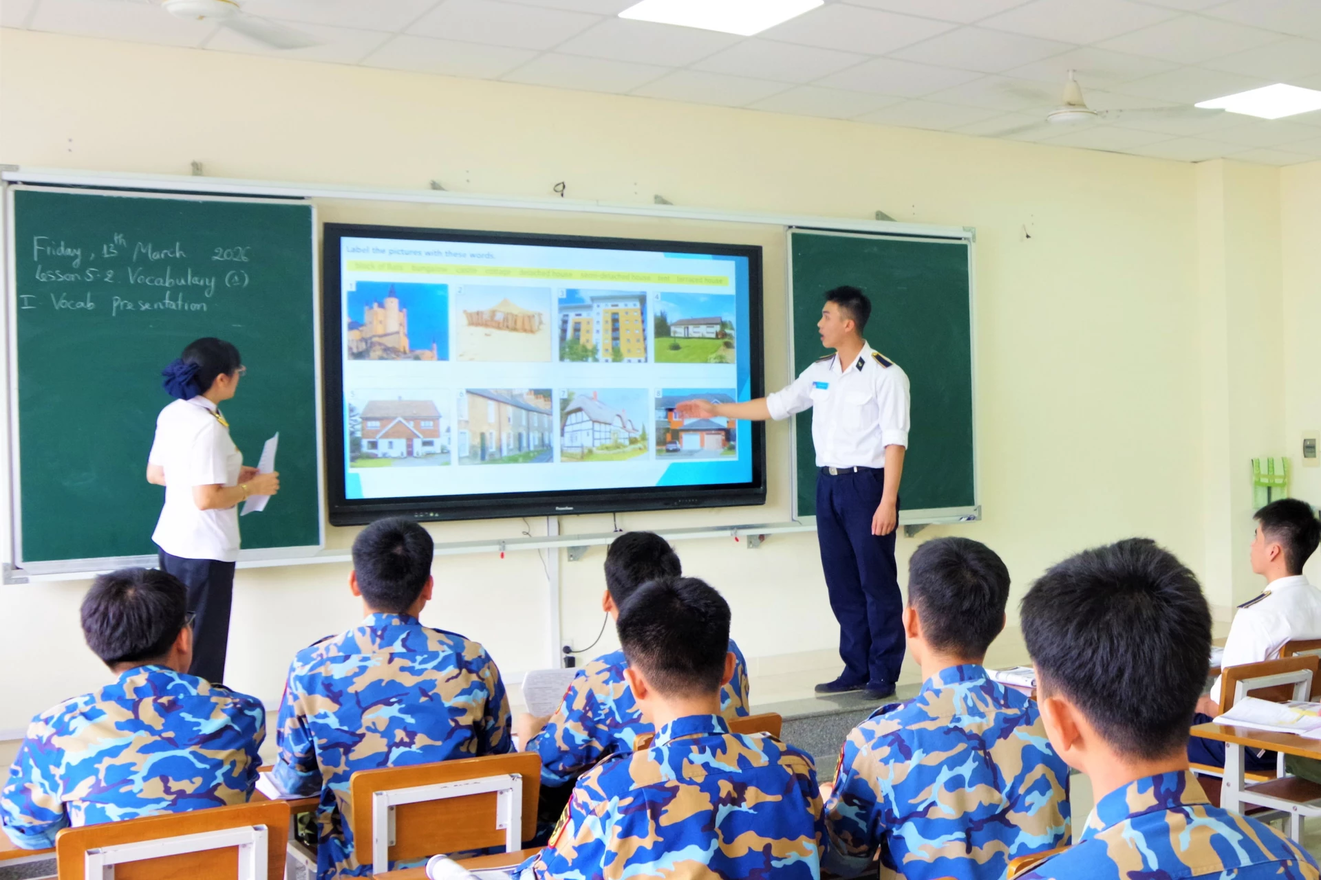 Thượng sĩ Lê Đoàn Mạnh Trí trao đổi với giảng viên trong giờ học tiếng Anh.