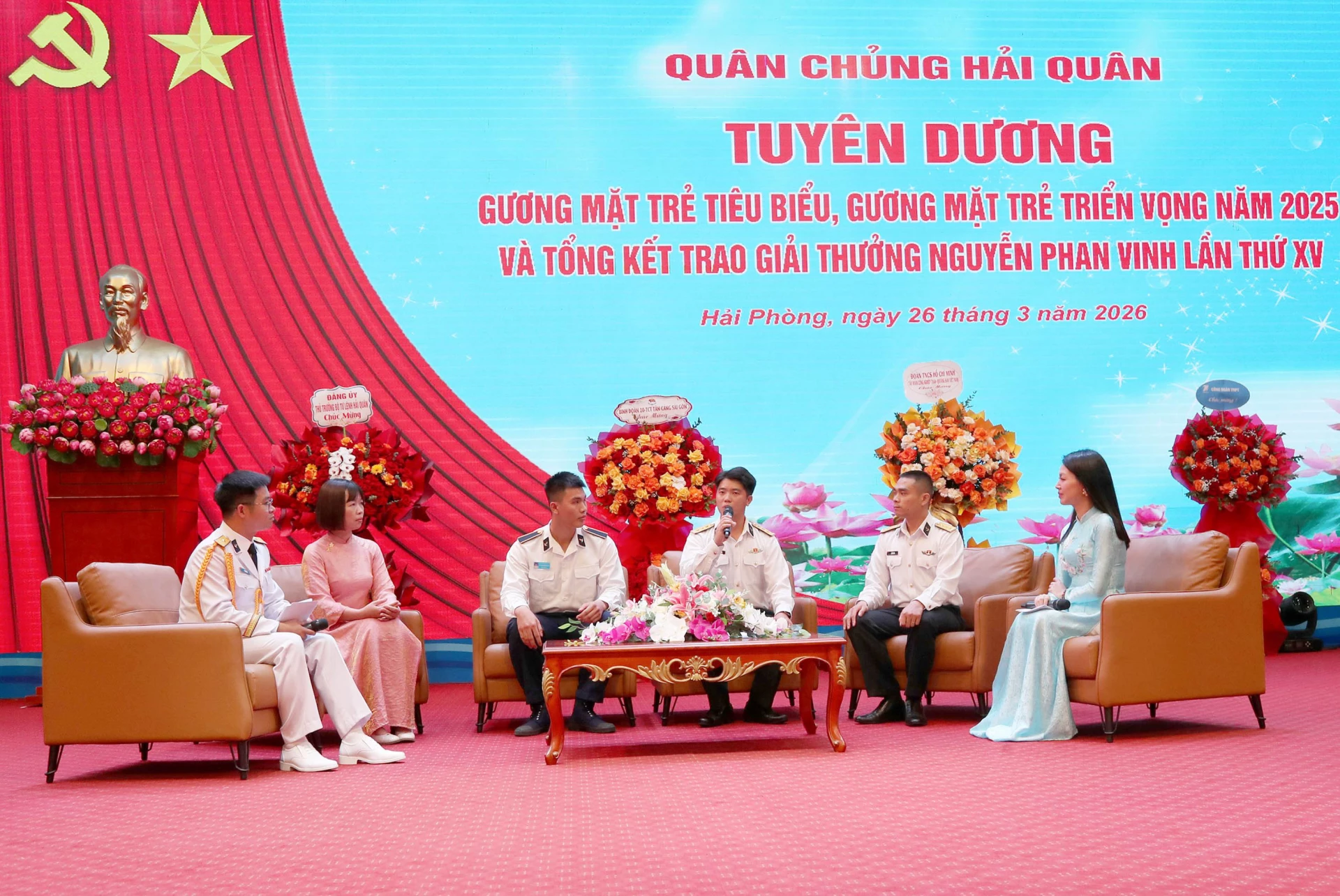 Thượng sĩ Lê Đoàn Mạnh Trí (thứ ba từ trái qua) tham gia tọa đàm tại chương trình tuyên dương gương mặt trẻ tiêu biểu, gương mặt trẻ triển vọng năm 2025 do Quân chủng Hải quân tổ chức.