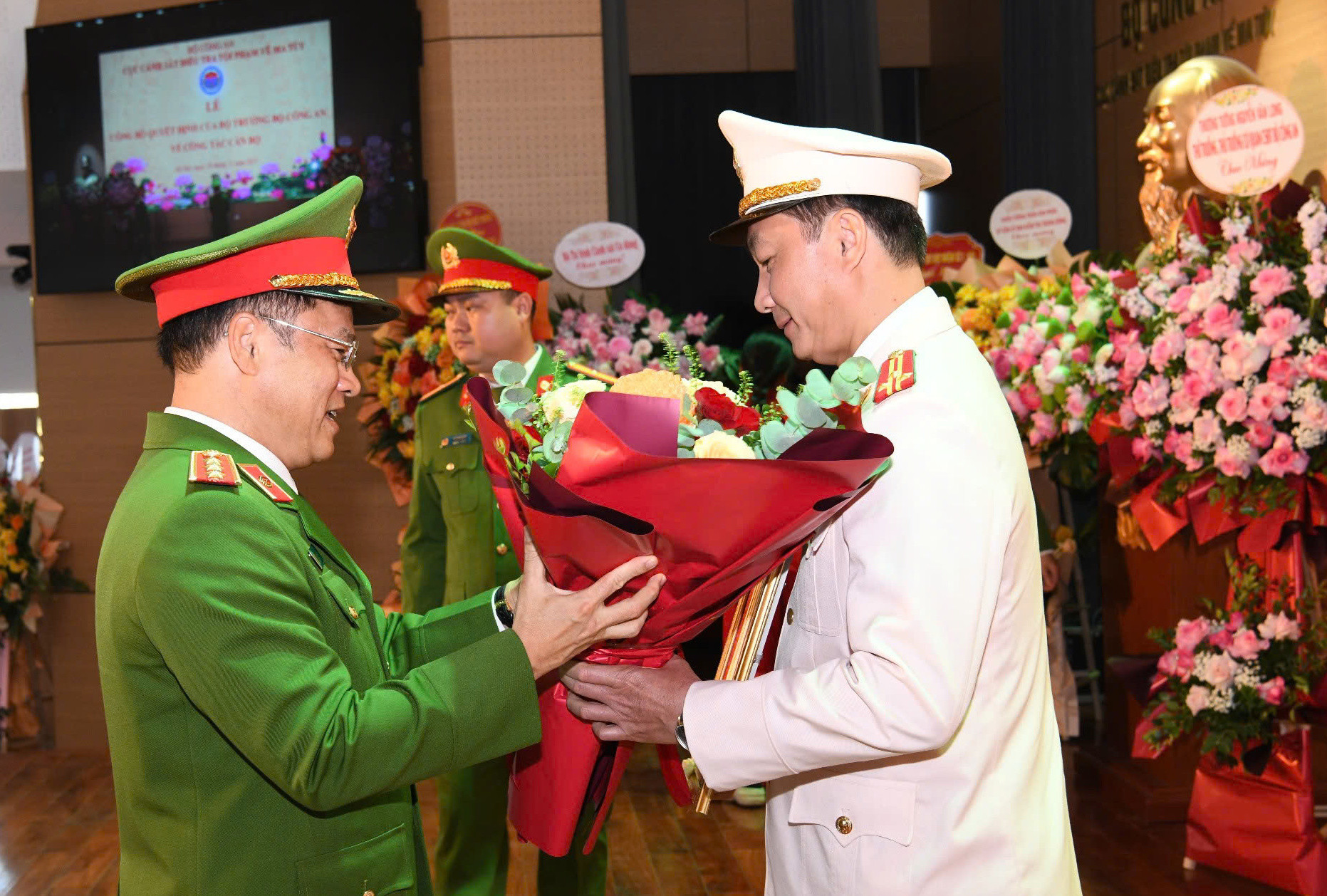 Thượng tướng Nguyễn Văn Long chúc mừng Thượng tá Bùi Duy Hưng và khẳng định việc điều động, bổ nhiệm nhiệm vụ mới là vinh dự lớn của cá nhân Thượng tá Hưng, cũng như tập thể C04 và Công an tỉnh Quảng Ninh.