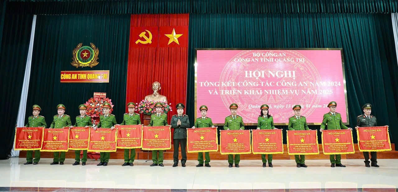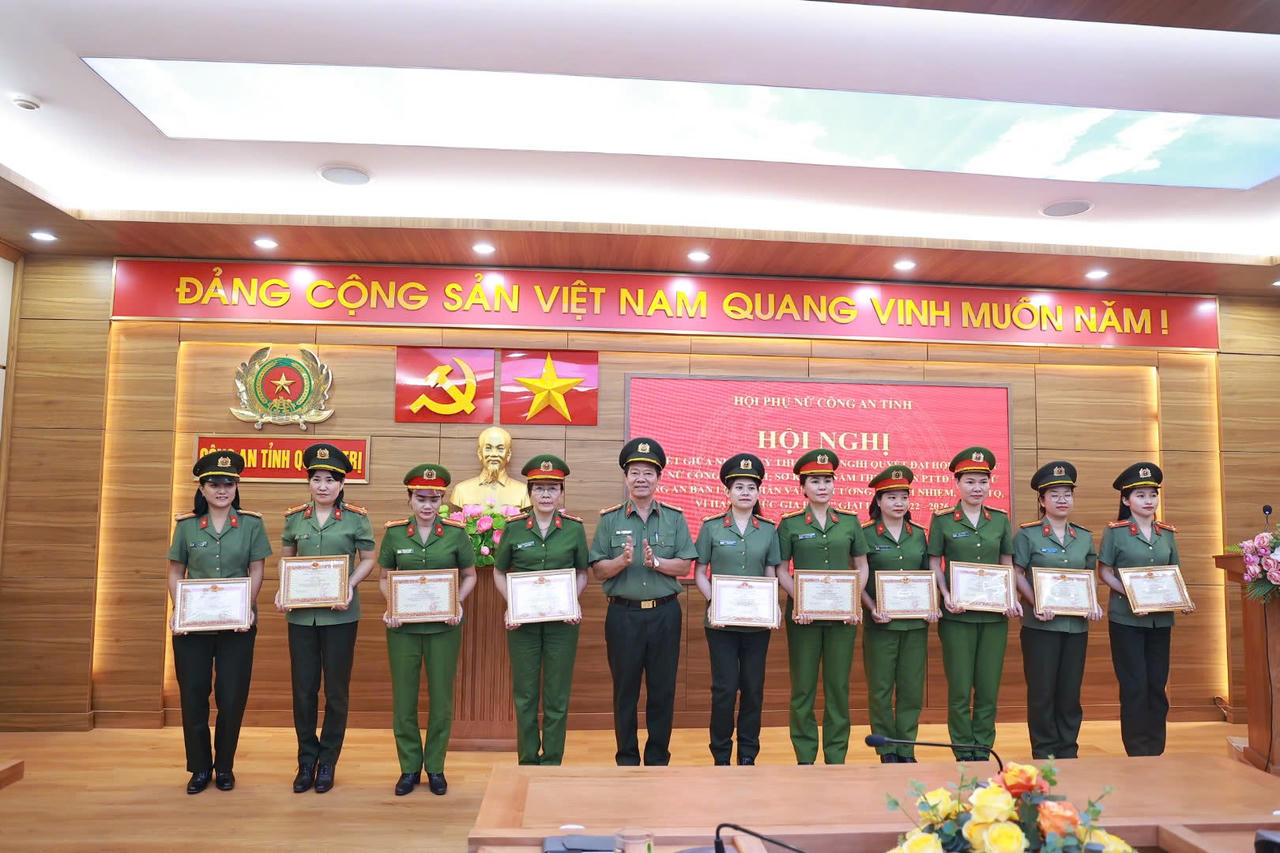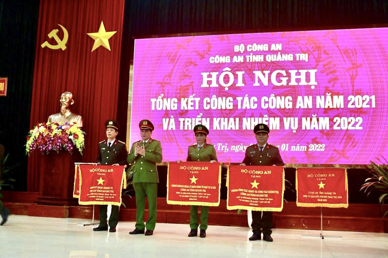 Thứ trưởng Bộ Công an Lê Quốc Hùng tặng Cờ thi đua của Bộ Công an cho đồng chí Hoàng Thị Hồng Phượng (thứ 3 từ trái sang).
