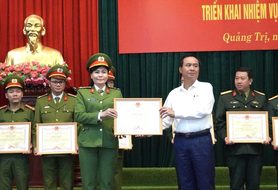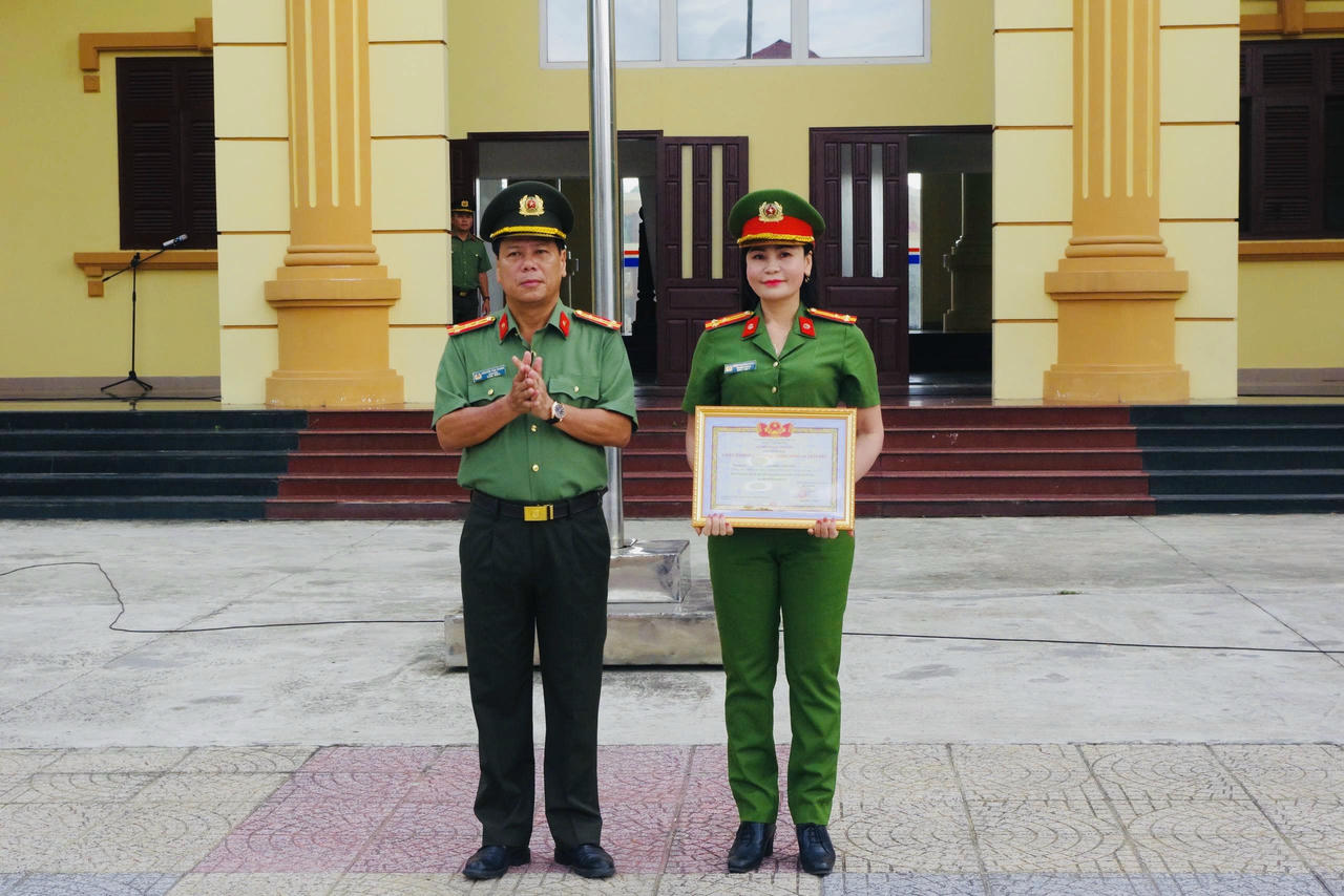 Đại tá Nguyễn Văn Thanh, Giám đốc Công an tỉnh Quảng Trị trao tặng danh hiệu "Chiến sỹ thi đua toàn lực lượng Công an nhân dân" năm 2023 cho đồng chí Hoàng Thị Hồng Phượng.