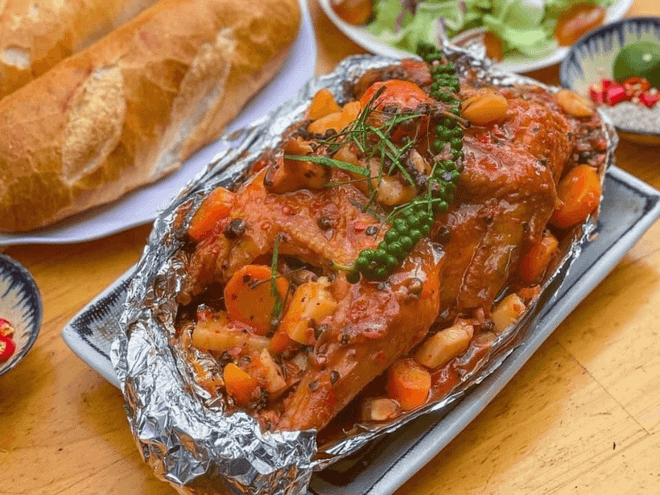 Gà được chế biến công phu từ khâu tẩm ướp đến nướng trên than đỏ, mang đến lớp da giòn rụm và thịt ngọt lịm. Hương vị đậm đà của nước sốt tiêu xanh thoang thoảng cay nồng làm tăng thêm sức hút.