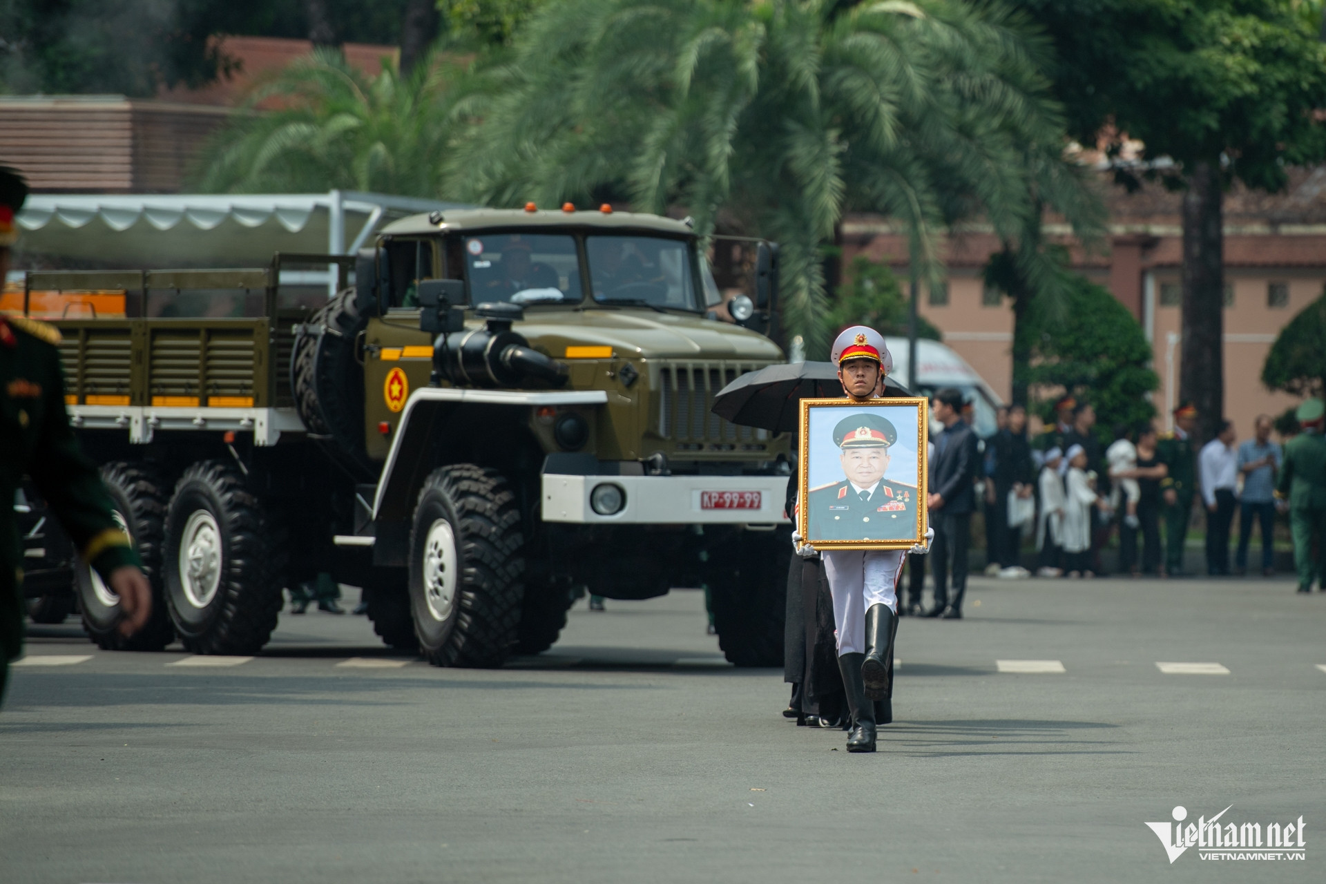 Sau khi kết thúc lễ truy điệu, sĩ quan trong đội tiêu binh rước di ảnh và linh cữu của Anh hùng lực lượng vũ trang nhân dân Lê Văn Dũng ra cỗ linh xa.