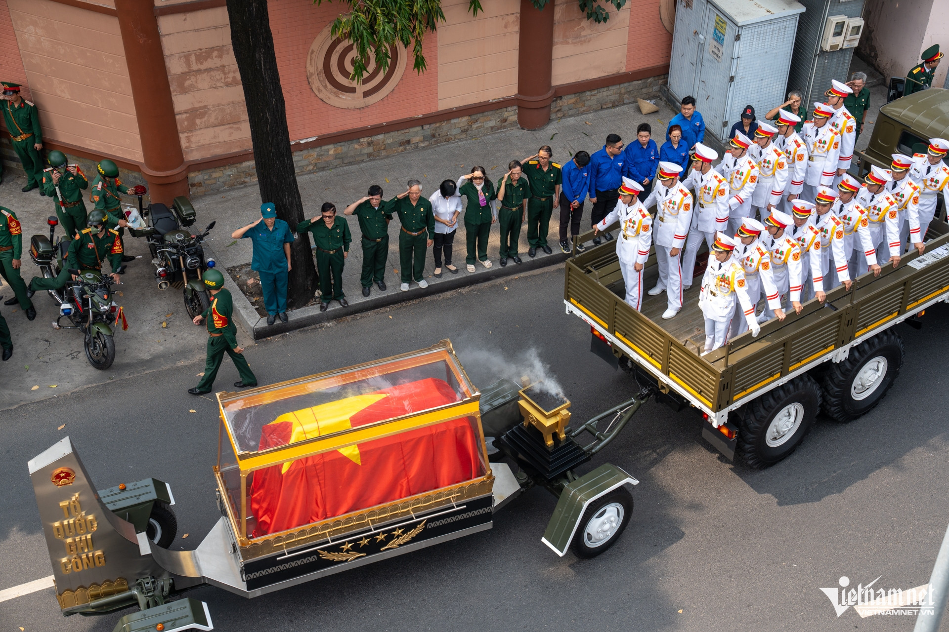 Đông đảo cựu chiến binh, người dân đứng hai bên đường Phạm Ngũ Lão để tiễn biệt vị Đại tướng anh hùng về với đất mẹ Đồng Khởi - Bến Tre (nay là tỉnh Vĩnh Long). Lễ an táng Đại tướng Lê Văn Dũng sẽ được tổ chức vào lúc 17h30 cùng ngày tại quê nhà là xã Phú Túc, tỉnh Vĩnh Long.