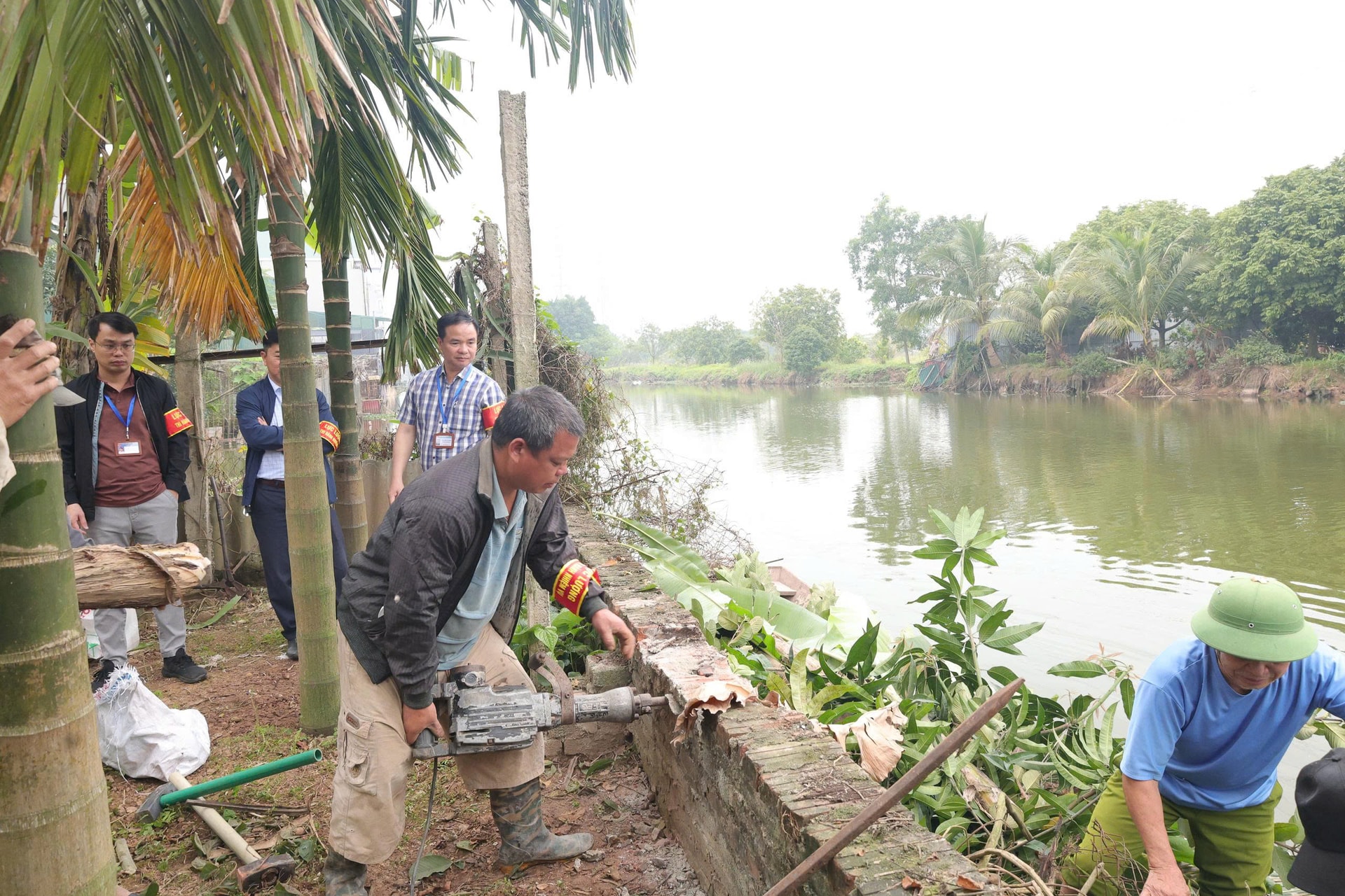 UBND xã Thường Tín cương quyết cưỡng chế các hạng mục công trình vi phạm do ông Chiện gây ra ở khu vực sông Cụt. Ảnh: Công Tâm
