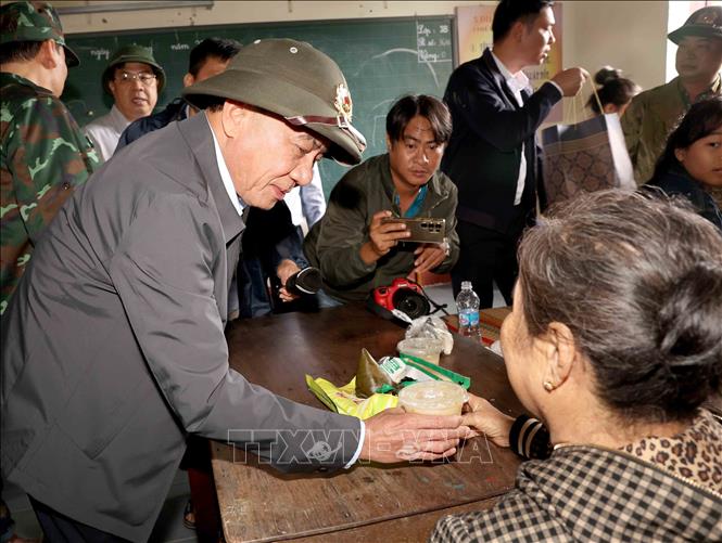 Thường trực Ban Bí thư Trần Cẩm Tú tặng quà hỗ trợ nhân dân xã Diên Điền, tỉnh Khánh Hòa ở nơi sơ tán. Ảnh: Phương Hoa/ TTXVN