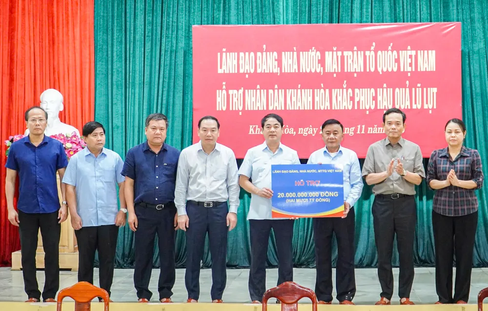 Dịp này, ông Trần Cẩm Tú thay mặt lãnh đạo Đảng, Nhà nước, MTTQ Việt Nam trao hỗ trợ tỉnh Khánh Hòa 20 tỉ đồng.