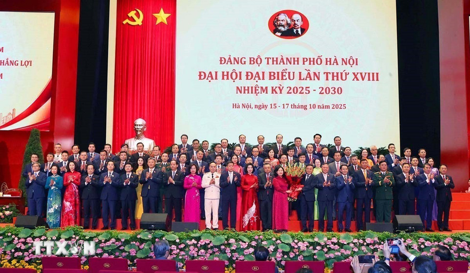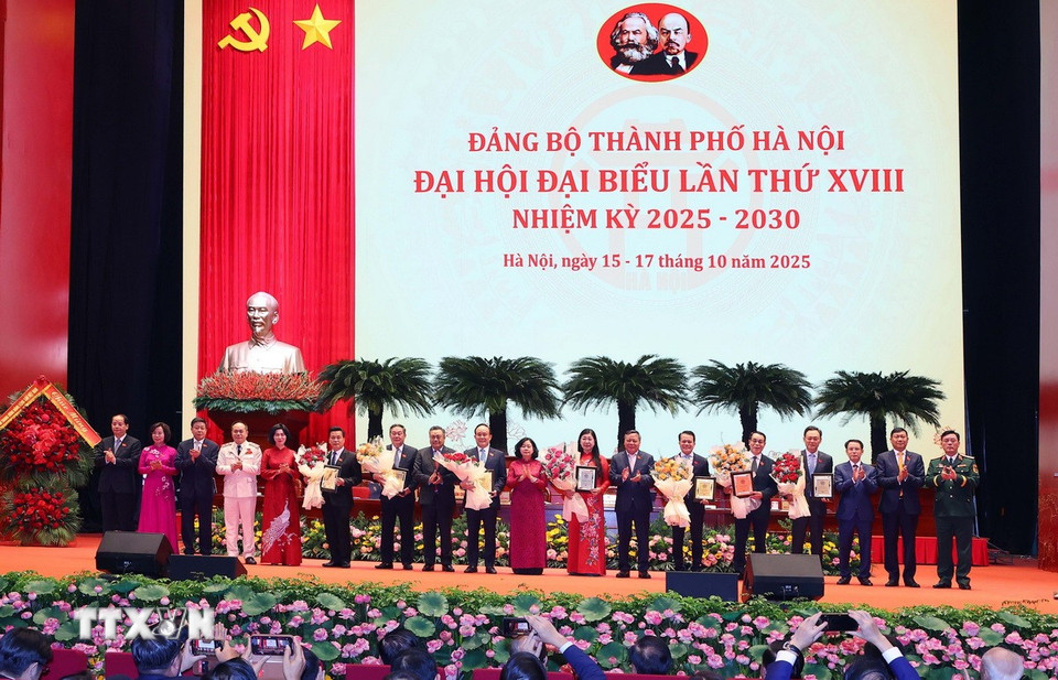 Đồng chí Trần Cẩm Tú, Ủy viên Bộ Chính trị, Thường trực Ban Bí thư tặng hoa Ban Chấp hành Đảng bộ thành phố Hà Nội lần thứ 18, nhiệm kỳ 2025-2030 ra mắt Đại hội. (Ảnh: Văn Điệp/TTXVN)
