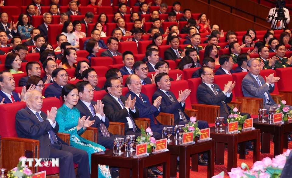 Thường trực Ban Bí thư Trần Cẩm Tú với các đại biểu tại phiên bế mạc. (Ảnh: Văn Điệp/TTXVN)