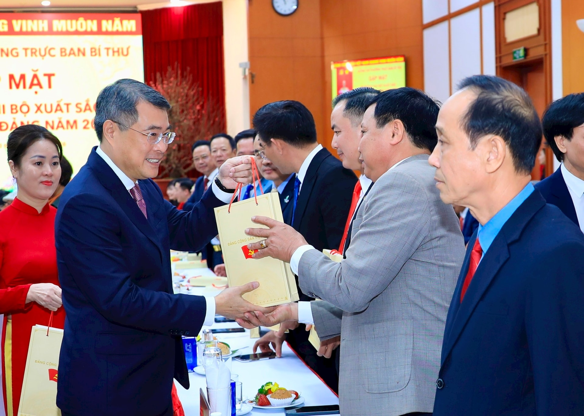 Trưởng ban Tổ chức Trung ương Lê Minh Hưng trao tặng quà của Tổng Bí thư Lô Lâm cho các bí thư chi bộ tiêu biểu trong toàn Đảng. Ảnh: Quang Thái