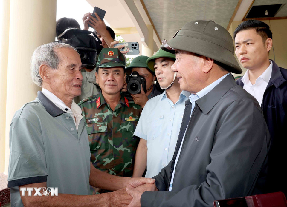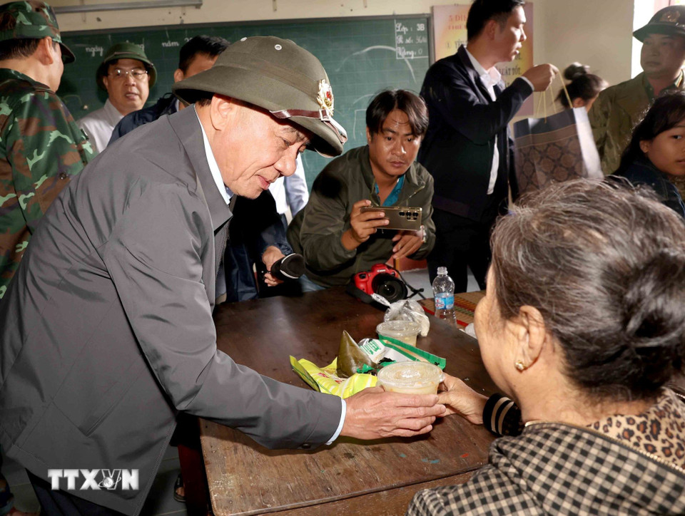 Thường trực Ban Bí thư Trần Cẩm Tú thăm, động viên nhân dân xã Diên Điền, tỉnh Khánh Hòa tại nơi sơ tán. (Ảnh: Phương Hoa/TTXVN)