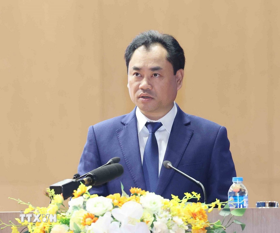 Đồng chí Trịnh Việt Hùng, Ủy viên Dự khuyết Trung ương Đảng, Bí thư Tỉnh ủy Lào Cai phát biểu tại hội nghị. (Ảnh: Phương Hoa/TTXVN)