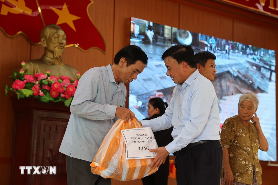 Thường trực Ban Bí thư Trần Cẩm Tú trao quà của lãnh đạo Đảng, Nhà nước cho cho thành phố Đà Nẵng để sớm khắc phục hậu quả của mưa lũ. (Ảnh: Anh Dũng/TTXVN)