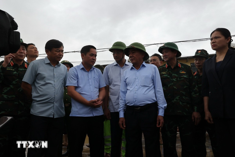Ông Trần Cẩm Tú, Thường trực Ban Bí thư, đến động viên các lực lượng đang ngày đêm gia cố, bảo vệ bờ kè tại thôn An Lương bị sạt lở uy hiếp đến tính mạng tài sản của hàng trăm hộ dân xã Duy Nghĩa. (Ảnh: Anh Dũng/TTXVN)