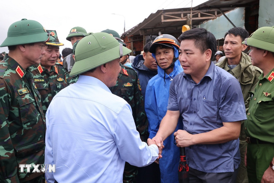 Ông Trần Cẩm Tú, Thường trực Ban Bí thư, động viên lãnh đạo xã Duy Nghĩa tập trung các nguồn lực chăm lo cho bà con vượt qua mất mát do thiên tai. (Ảnh: Anh Dũng/TTXVN)