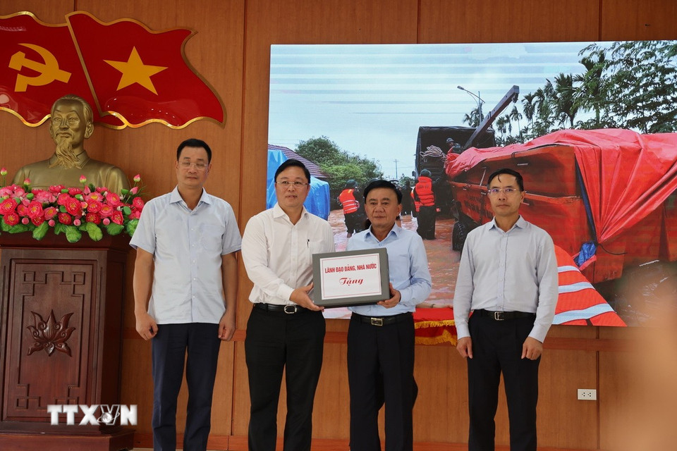 Thường trực Ban Bí thư Trần Cẩm Tú trao quà của lãnh đạo Đảng, Nhà nước cho bà con xã Duy Nghĩa bị ảnh hưởng nặng nề do mưa lũ. (Ảnh: Anh Dũng/TTXVN)