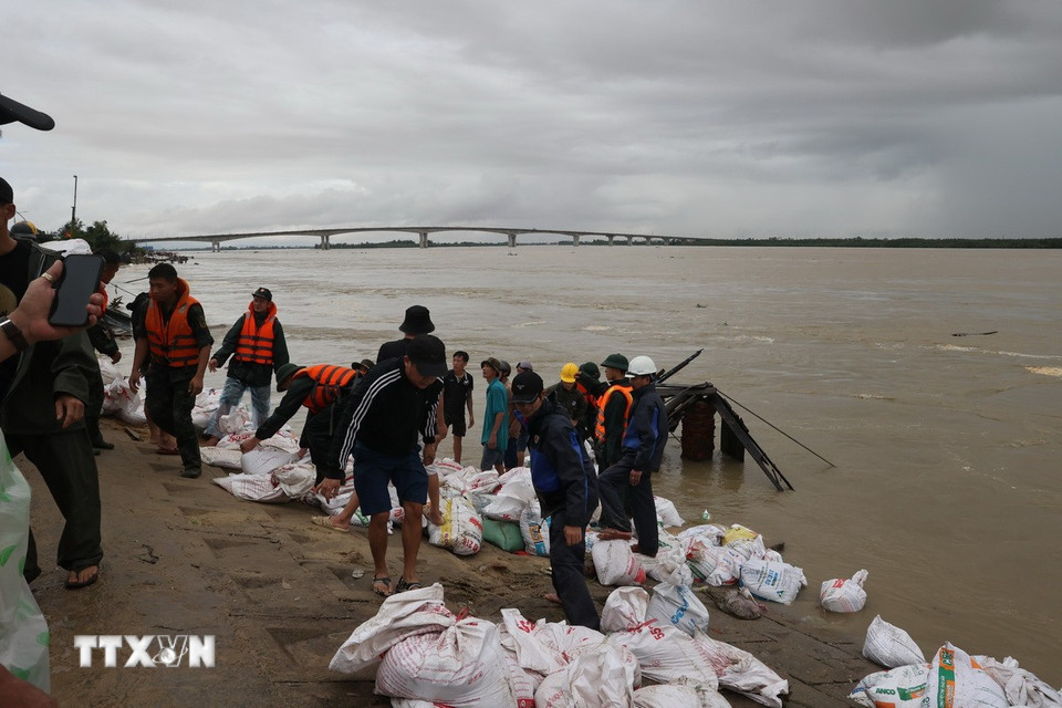 Hàng trăm cán bộ, chiến sỹ và nhân dân đang khẩn trương gia cố, bảo vệ bờ kè tại thôn An Lương bị sạt lở uy hiếp đến tính mạng tài sản của hàng trăm hộ dân xã Duy Nghĩa. (Ảnh: Anh Dũng/TTXVN)