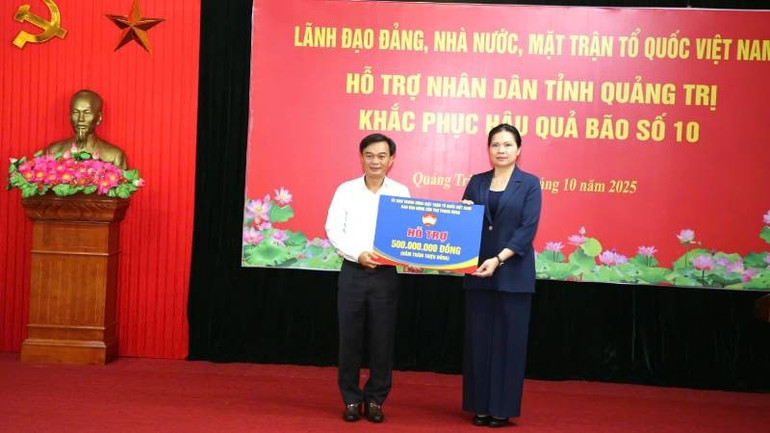 Phó Chủ tịch Ủy ban Trung ương Mặt trận Tổ quốc Việt Nam Hà Thị Nga trao hỗ trợ tỉnh Quảng Trị 500 triệu đồng.