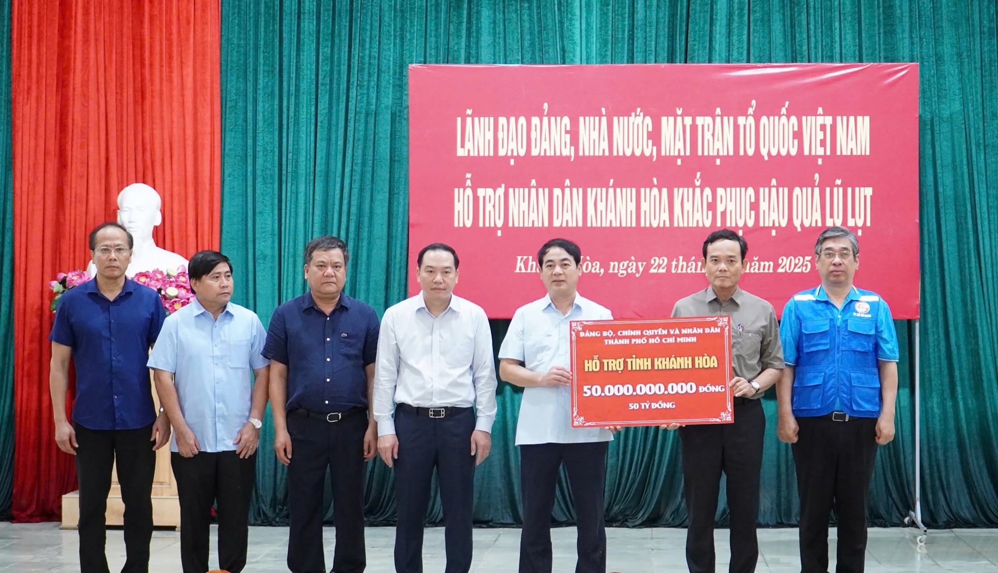 Cũng trong sáng nay, TP Hồ Chí Minh đã hỗ trợ tỉnh Khánh Hòa 50 tỷ đồng; cử 50 bác sĩ đến 5 điểm tập trung đông người dân để khám, chữa bệnh; sử dụng thiết bị bay hỗ trợ thả hàng cứu trợ; triển khai 60 tình nguyện viên tổ chức các bếp nấu cơm cho người dân vùng lũ.
