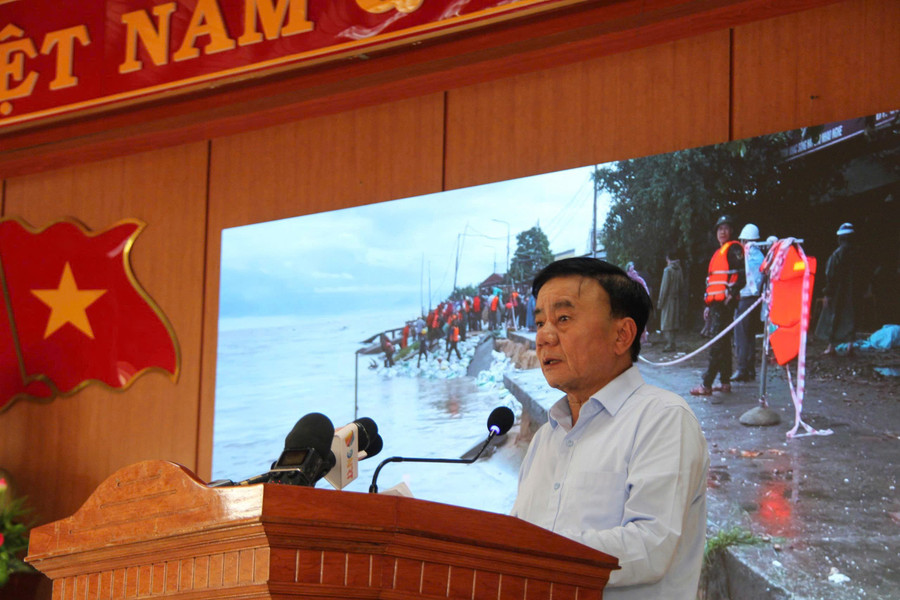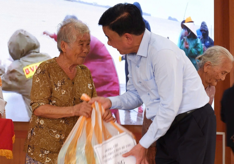 Kế đó, Thường trực Ban Bí thư Trần Cẩm Tú đi thị sát, kiểm tra công tác khắc phục bờ kè An Lương (xã Duy Nghĩa) và tặng quà cho người dân bị ảnh hưởng bởi mưa lũ.
