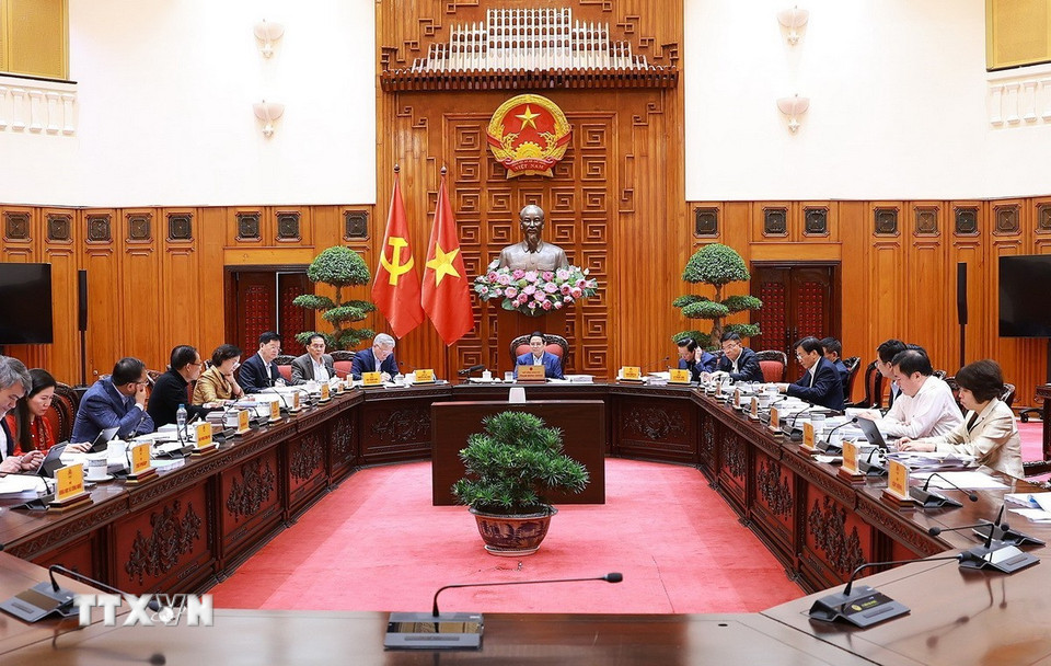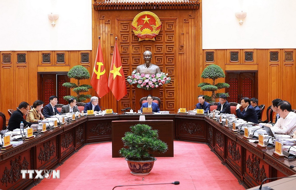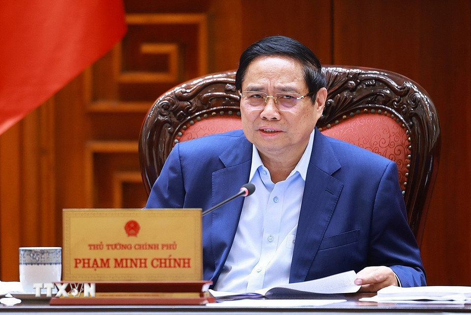 Thủ tướng Phạm Minh Chính chủ trì họp Thường trực Chính phủ về phát triển Đề án Khu thương mại tự do và Trung tâm lọc hóa dầu và năng lượng quốc gia tại Dung Quất. (Ảnh: Dương Giang/TTXVN)