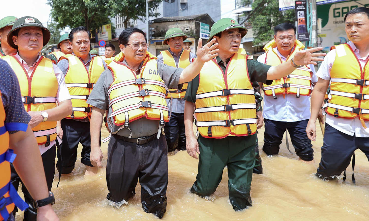 Thủ tướng Phạm Minh Chính, Bộ trưởng Quốc phòng Phan Văn Giang thị sát tình hình, kiểm tra, động viên các lực lượng đang làm nhiệm vụ khắc phục hậu quả thiên tai, tiếp tế nhu yếu phẩm cho người dân tại Thái Nguyên. (Ảnh: VGP)
