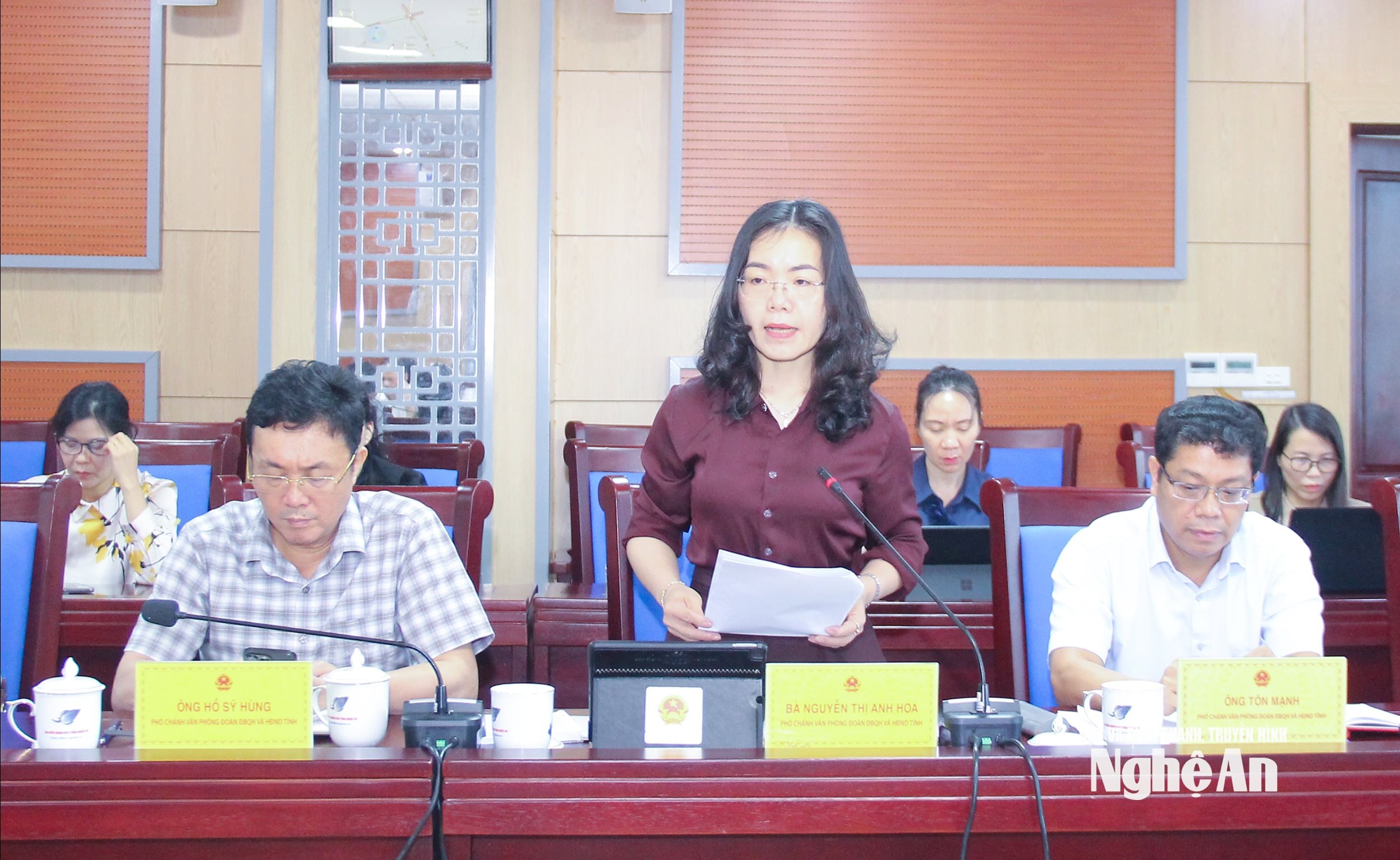 Phó Chánh Văn phòng Đoàn đại biểu Quốc hội và HĐND tỉnh Nguyễn Thị Anh Hoa báo cáo kết quả hoạt động của Thường trực HĐND tỉnh tháng 3/2026. Ảnh: Mai Hoa