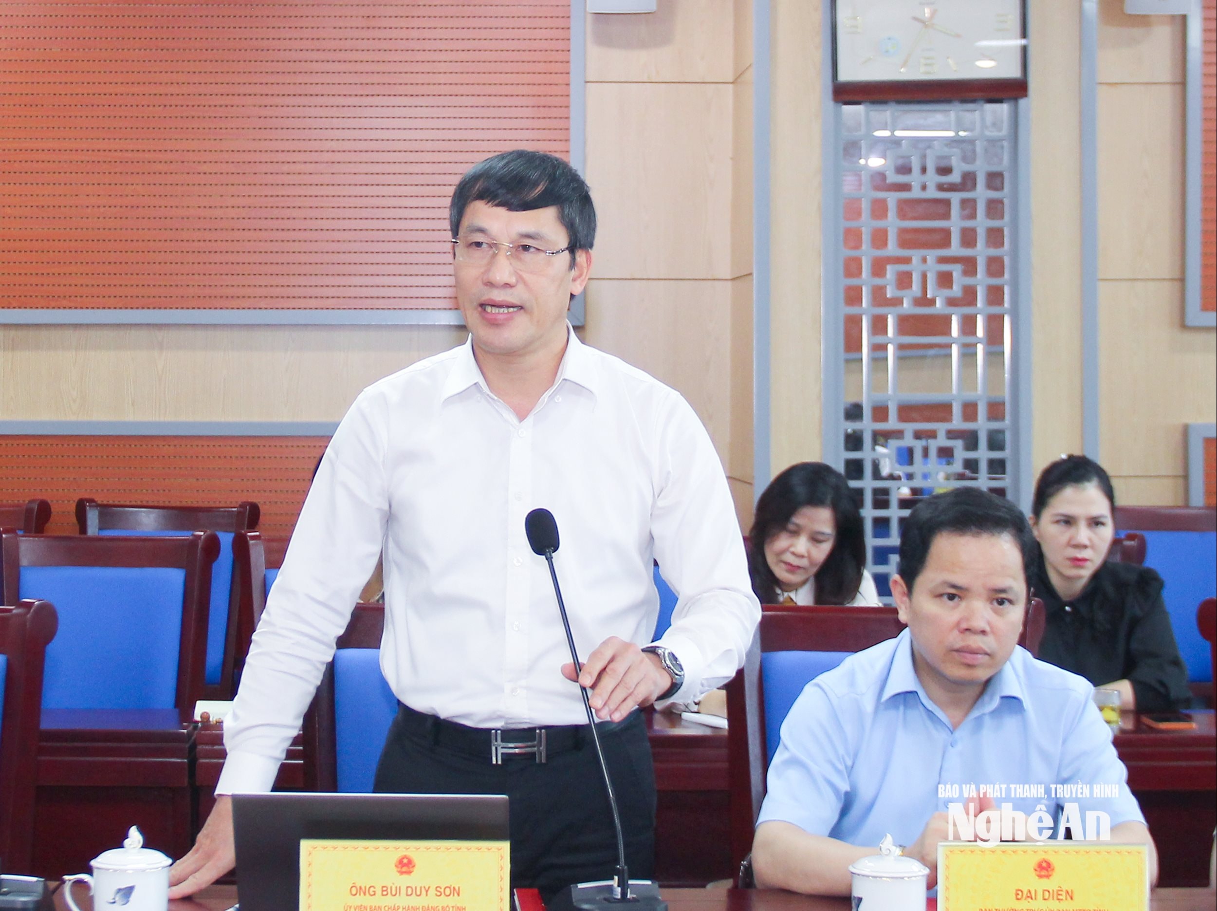 Đồng chí Bùi Duy Sơn - Ủy viên Ban Chấp hành Đảng bộ tỉnh, Chánh Văn phòng Đoàn đại biểu Quốc hội và HĐND tỉnh báo cáo việc chuẩn bị nội dung kỳ họp thứ nhất, HĐND tỉnh khóa XIX, nhiệm kỳ 2026 - 2031. Ảnh: Mai Hoa