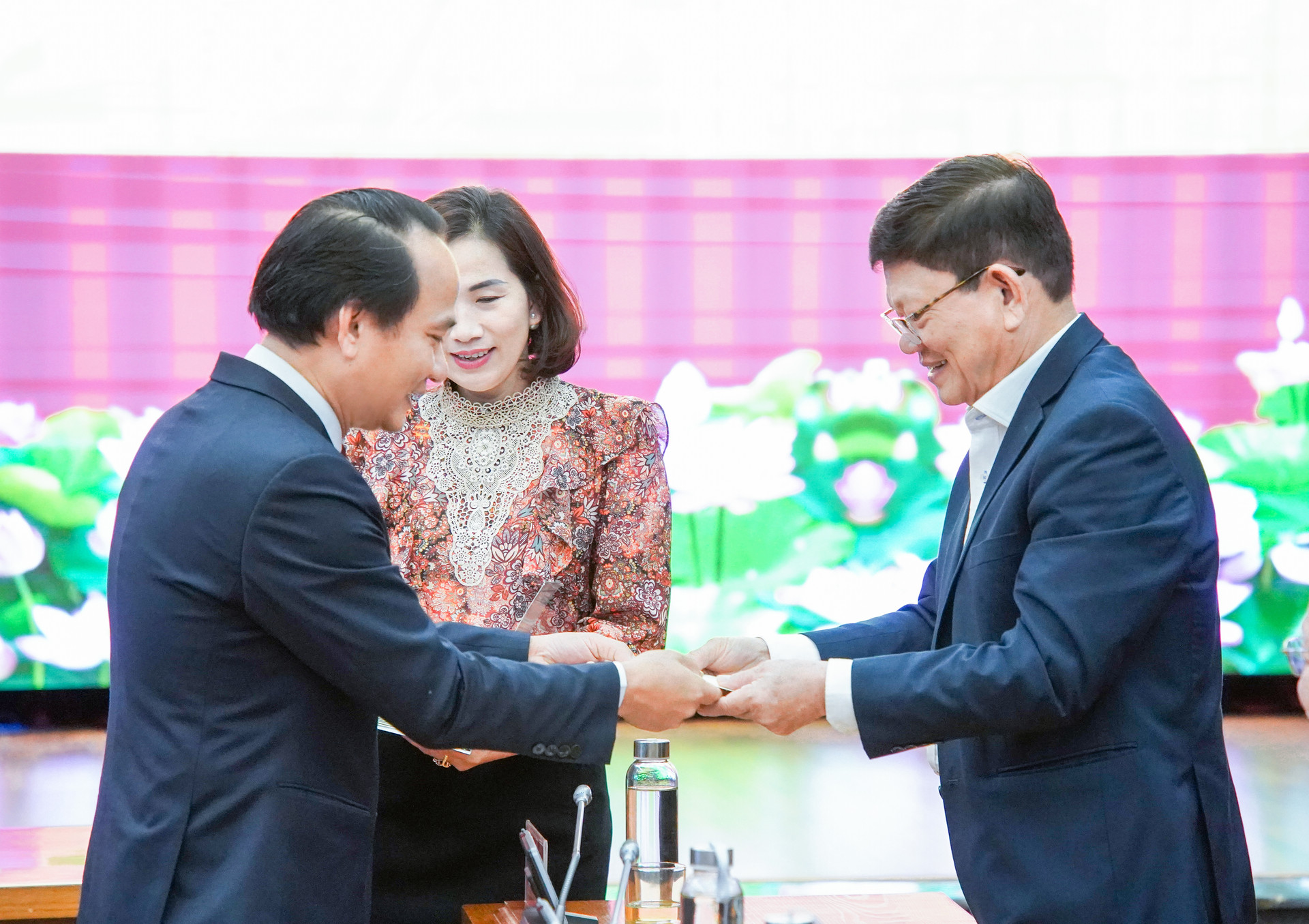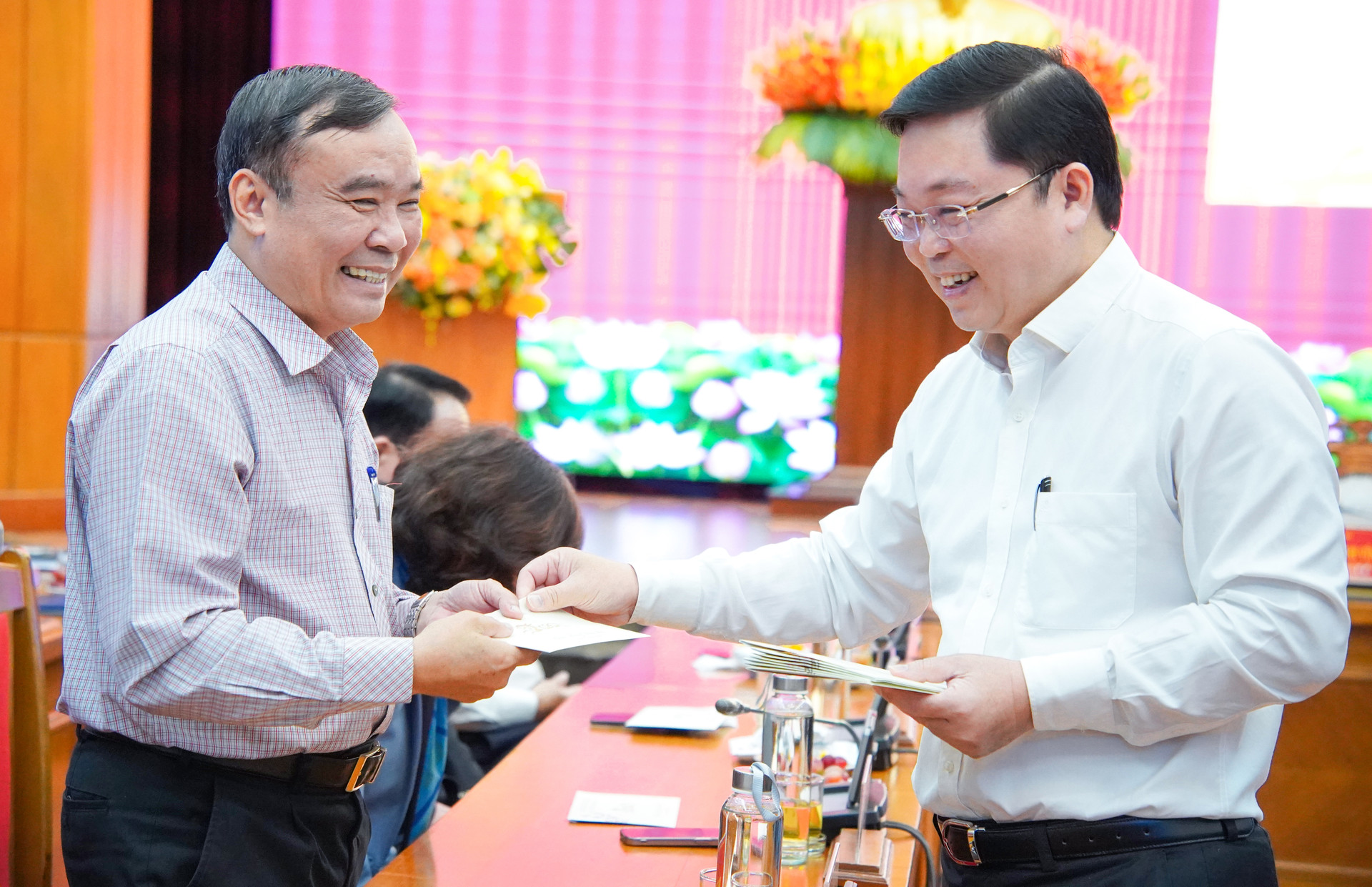 Chủ tịch Ủy ban MTTQ Việt Nam thành phố Lê Trí Thanh lì xì, chúc Tết lãnh đạo các hội quần chúng được Đảng, Nhà nước giao nhiệm vụ. Ảnh: NGỌC PHÚ