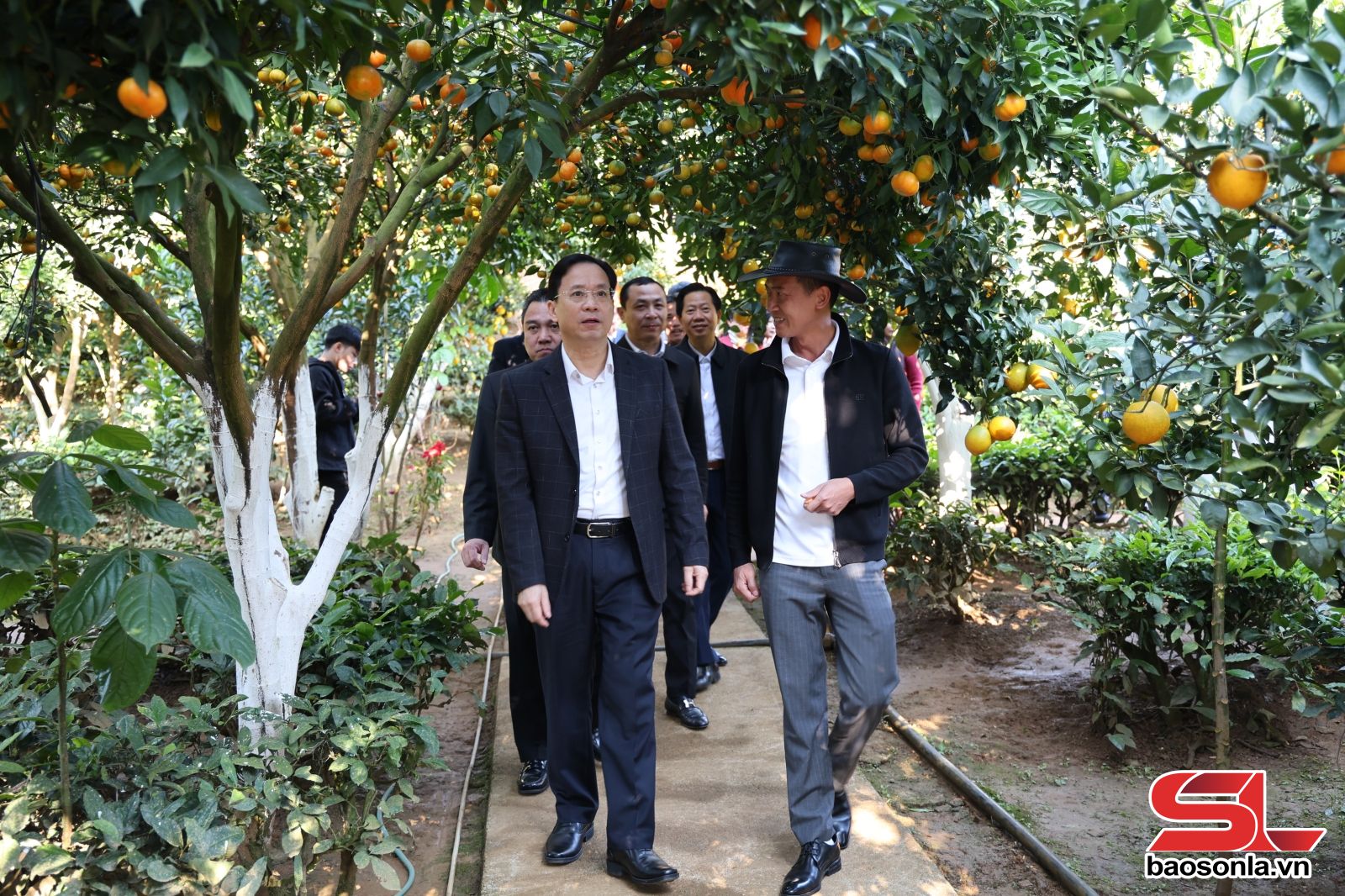 Các đồng chí lãnh đạo tỉnh thăm mô hình cam Navel tại phường Vân Sơn.