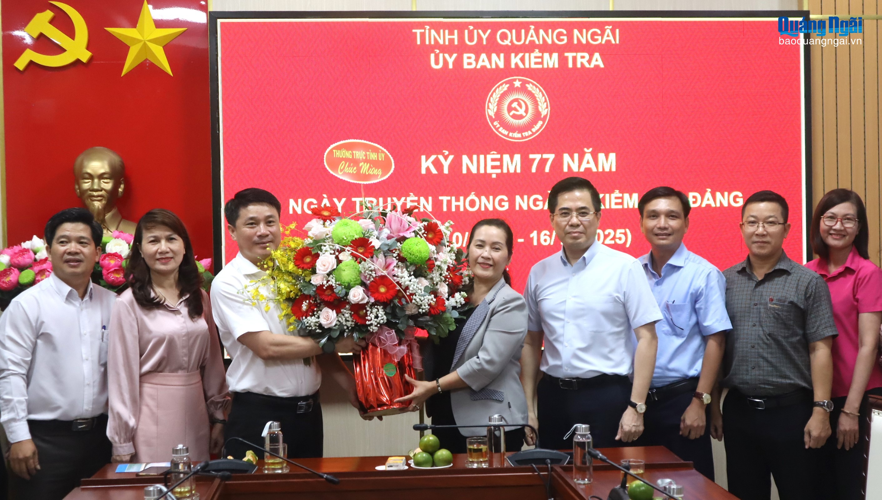 Nhân dịp này, Phó Bí thư Tỉnh ủy, Chủ tịch UBND tỉnh Nguyễn Hoàng Giang và Phó Bí thư Tỉnh ủy Đinh Thị Hồng Minh đã tặng hoa chúc mừng cán bộ, công chức, người lao động Ủy ban Kiểm tra Tỉnh ủy nhân kỷ niệm 77 năm ngày truyền thống ngành Kiểm tra Đảng.