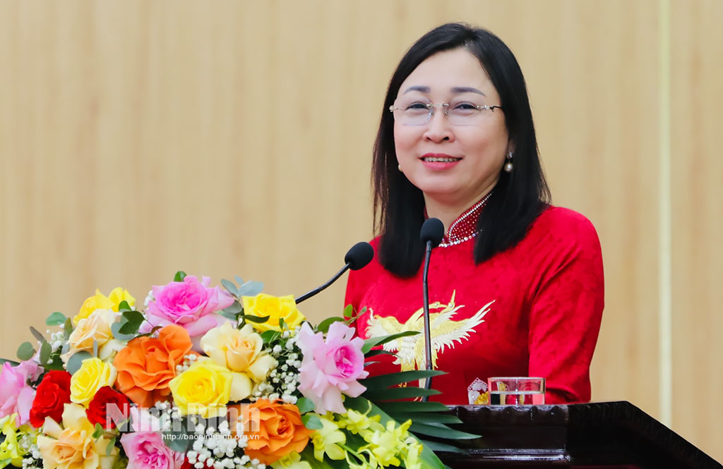 Đồng chí Đinh Thị Lụa, Phó Bí thư Thường trực Tỉnh ủy phát biểu chúc mừng tại buổi gặp mặt.