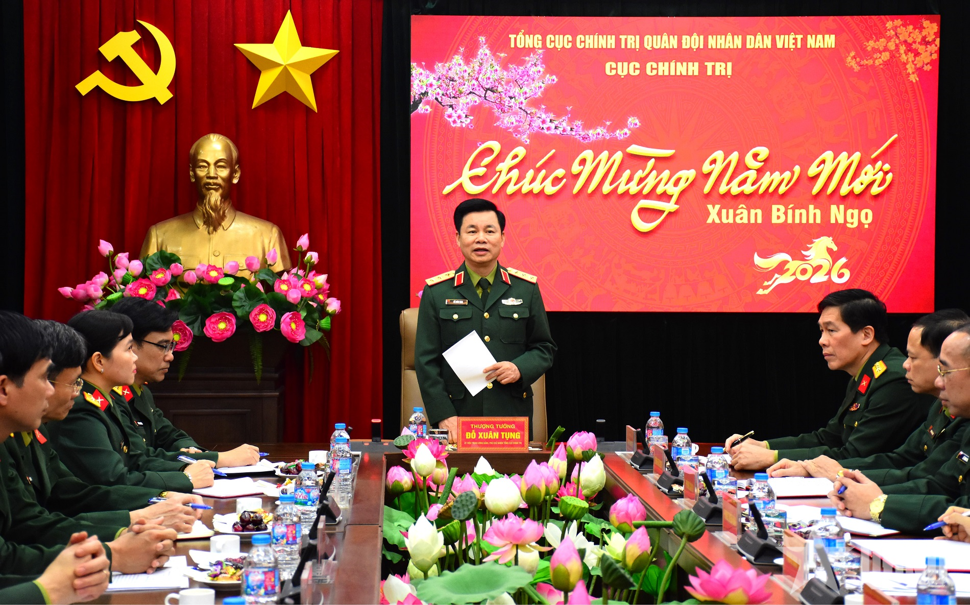 Trong không khí ấm áp, thân mật, thay mặt lãnh đạo TCCT, Thượng tướng Đỗ Xuân Tụng gửi tới các đồng chí chỉ huy Cục Chính trị, chỉ huy các phòng, ban cùng toàn thể cán bộ, nhân viên lời chúc mừng năm mới tốt đẹp với khí thế mới và nhiều thắng lợi mới.