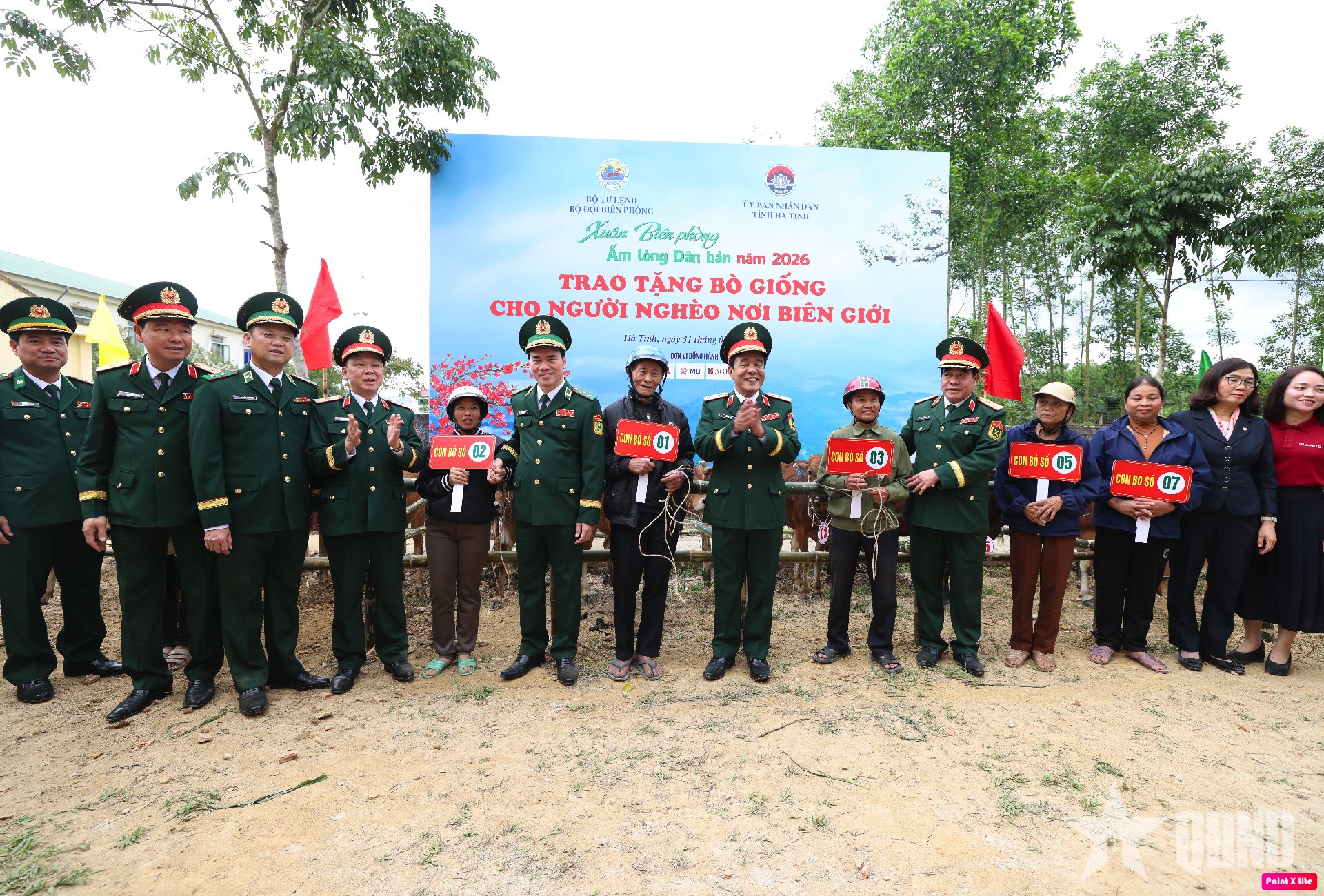 Thượng tướng Lê Đức Thái và lãnh đạo Bộ tư lệnh Bộ đội Biên phòng trao bò giống tặng bà con.