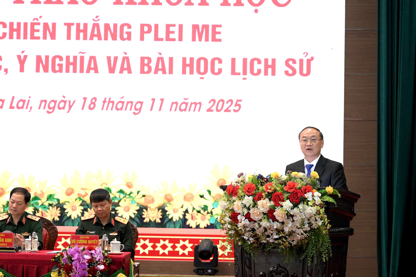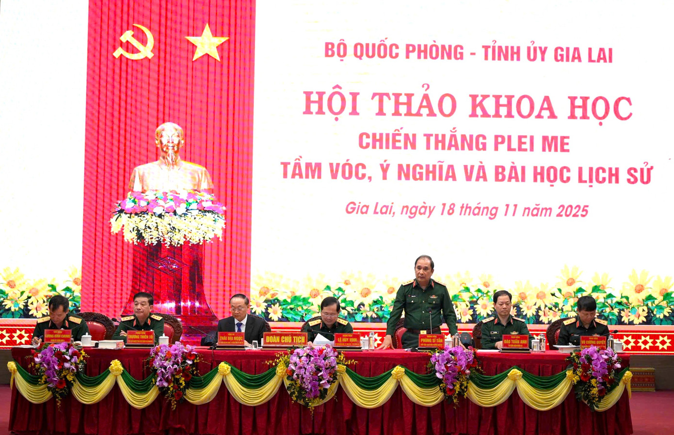 Ngày 18/11, tại phường Pleiku, Bộ Quốc phòng phối hợp với Tỉnh ủy Gia Lai tổ chức Hội thảo khoa học với chủ đề “Chiến thắng Plei Me - Tầm vóc, ý nghĩa và bài học lịch sử” nhân kỷ niệm 60 năm Chiến thắng Plei Me (26/11/1965-26/11/2025).