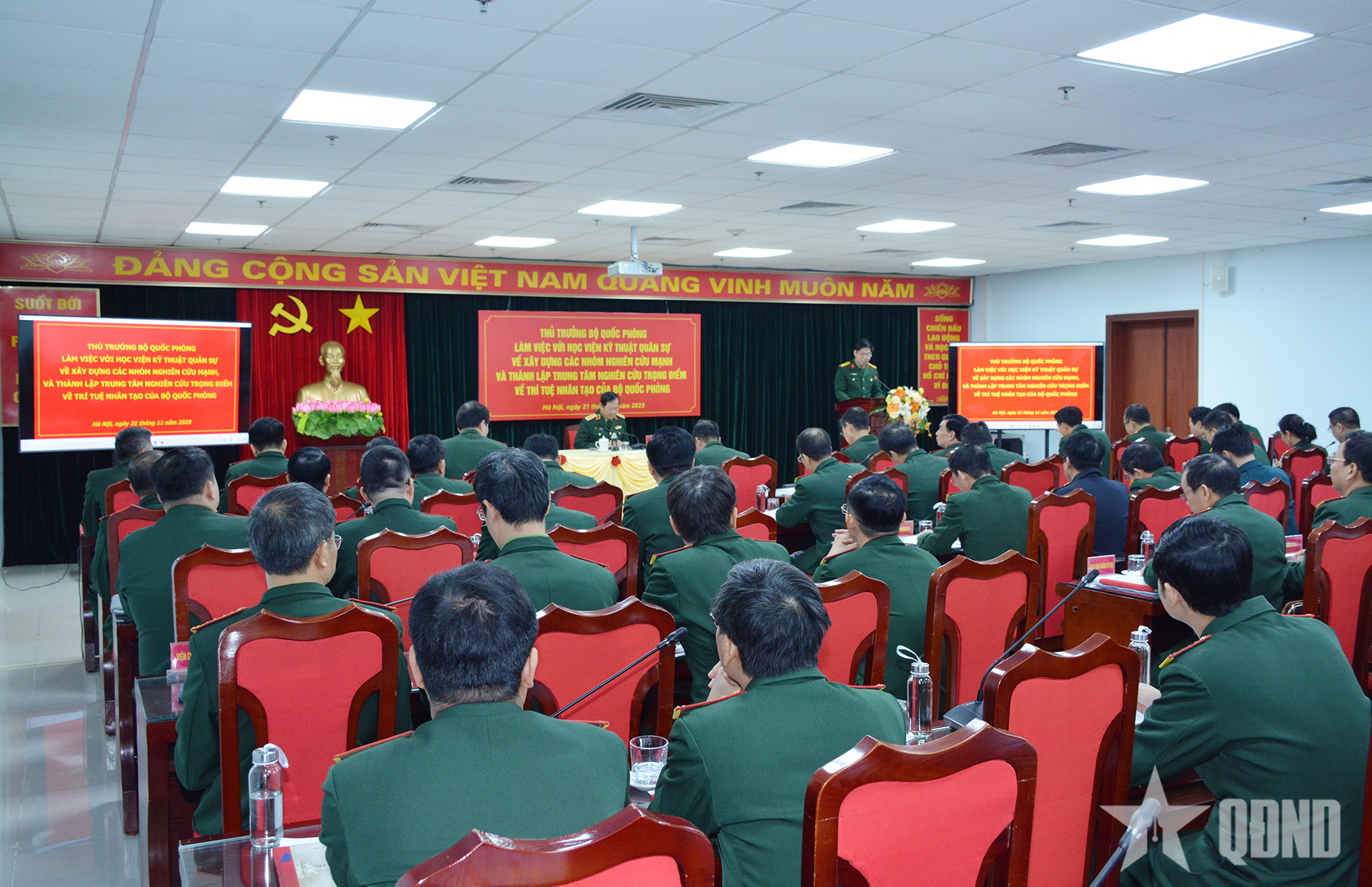 Đồng thời, đến nay, Học viện Kỹ thuật Quân sự đã hoàn thành Đề án thành lập Trung tâm nghiên cứu trọng điểm về AI và khoa học dữ liệu của Bộ Quốc phòng tại Học viện; báo cáo thủ trưởng Bộ Quốc phòng, thủ trưởng Bộ Tổng Tham mưu Quân đội nhân dân Việt Nam. Chức năng của Trung tâm là nghiên cứu, ứng dụng, thực nghiệm, thiết kế, chuyển giao công nghệ, tham gia đào tạo cán bộ chuyên môn sâu; tư vấn, thẩm định, phản biện các chương trình nghiên cứu, ứng dụng về AI và khoa học dữ liệu. Phối hợp tham mưu cho Bộ Quốc phòng trong việc xây dựng chiến lược và hoạch định chính sách nhằm đẩy mạnh nghiên cứu, phát triển, triển khai và ứng dụng công nghệ AI và khoa học dữ liệu vào các lĩnh vực quân sự, quốc phòng. Học viện đặt mục tiêu đưa Trung tâm trở thành một đơn vị nghiên cứu tiên phong công nghệ nền, công nghệ lõi dẫn dắt định hướng ứng dụng lĩnh vực AI và khoa học dữ liệu của Bộ Quốc phòng, có tầm cỡ quốc gia và khu vực, đóng góp tích cực vào hiện đại hóa Quân đội và nâng cao vị thế của khoa học công nghệ quốc phòng trên trường quốc tế.