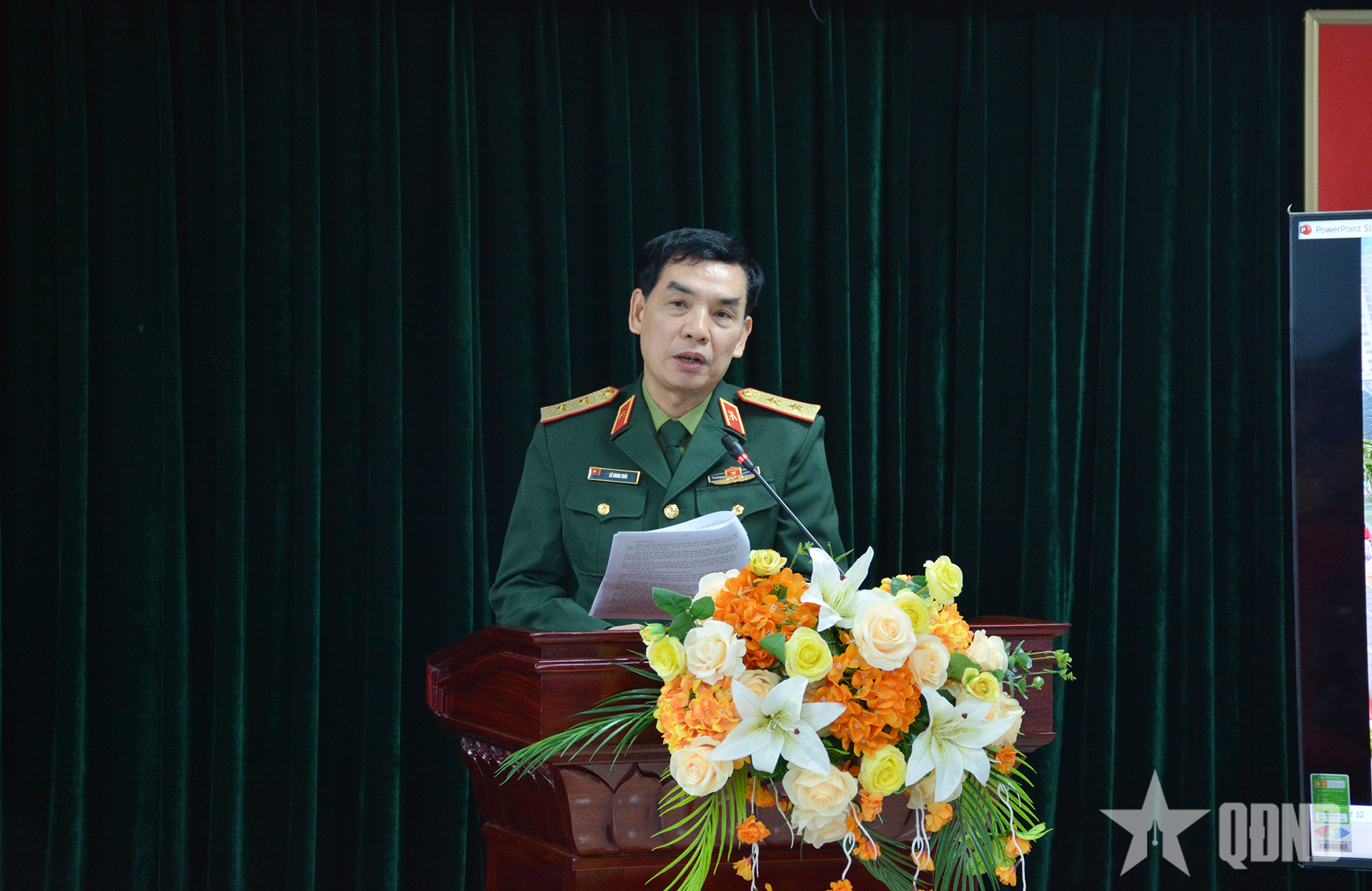 Trung tướng, GS, TS Lê Minh Thái, Giám đốc Học viện Kỹ thuật Quân sự trình bày báo cáo.