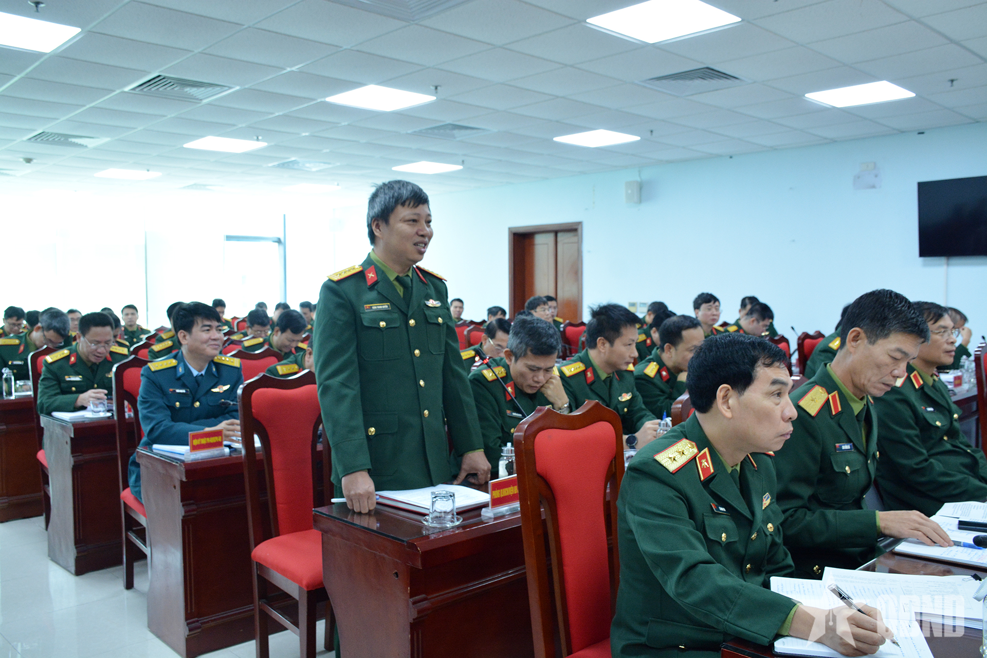 Cán bộ Học viện Kỹ thuật Quân sự tham gia ý kiến thảo luận tại buổi làm việc.