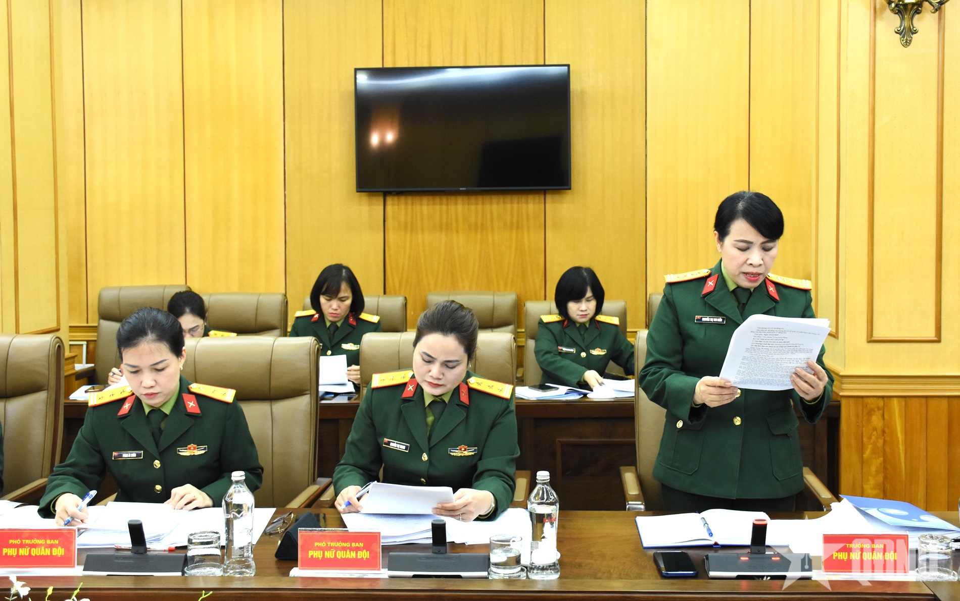 Đại tá Nguyễn Thị Thu Hiền, Trưởng ban Phụ nữ Quân đội báo cáo tại hội nghị.