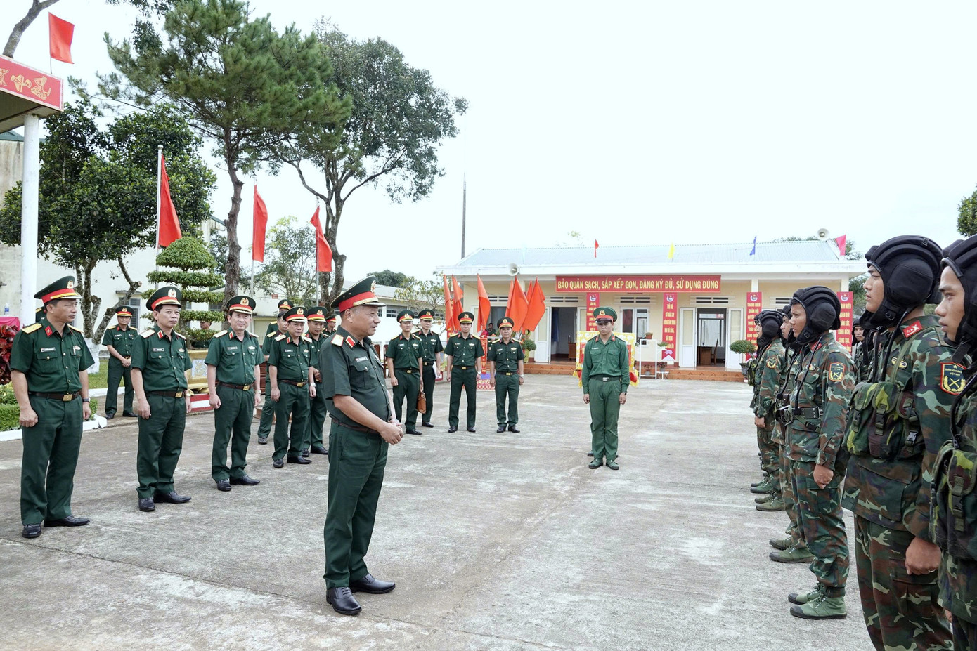 Thượng tướng Lê Quang Minh trò chuyện với cán bộ, chiến sĩ Trung đoàn Bộ binh cơ giới 48.